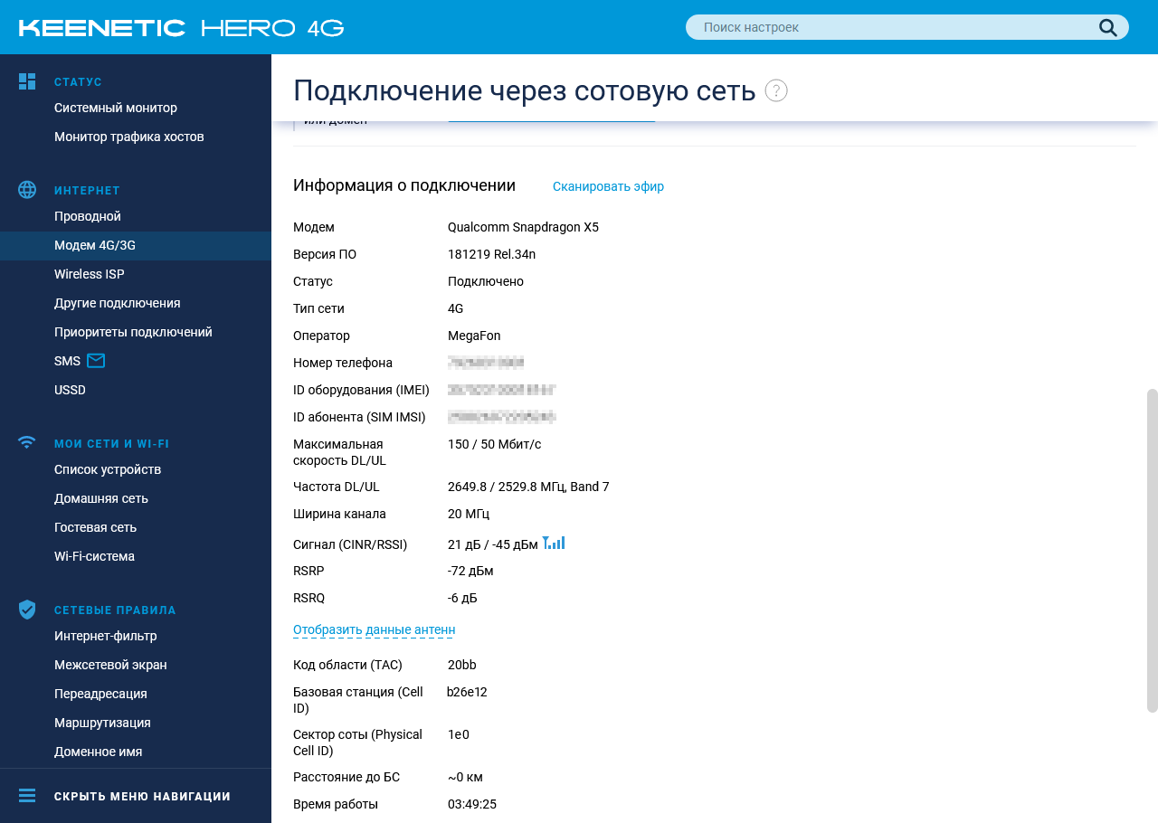 Еще больше технических данных представлено на странице «Подключение через сотовую сеть». Здесь можно узнать номер телефона, максимальные скорости, частоты, Band, ширину канала, номер базовой станции, оценку расстояния до нее, а также отчеты по антеннам. Конечно, многое из это пригодится только в случае сложной ситуации с приемом сигнала, когда нужно выбрать оптимальное место расположение роутера и антенн.