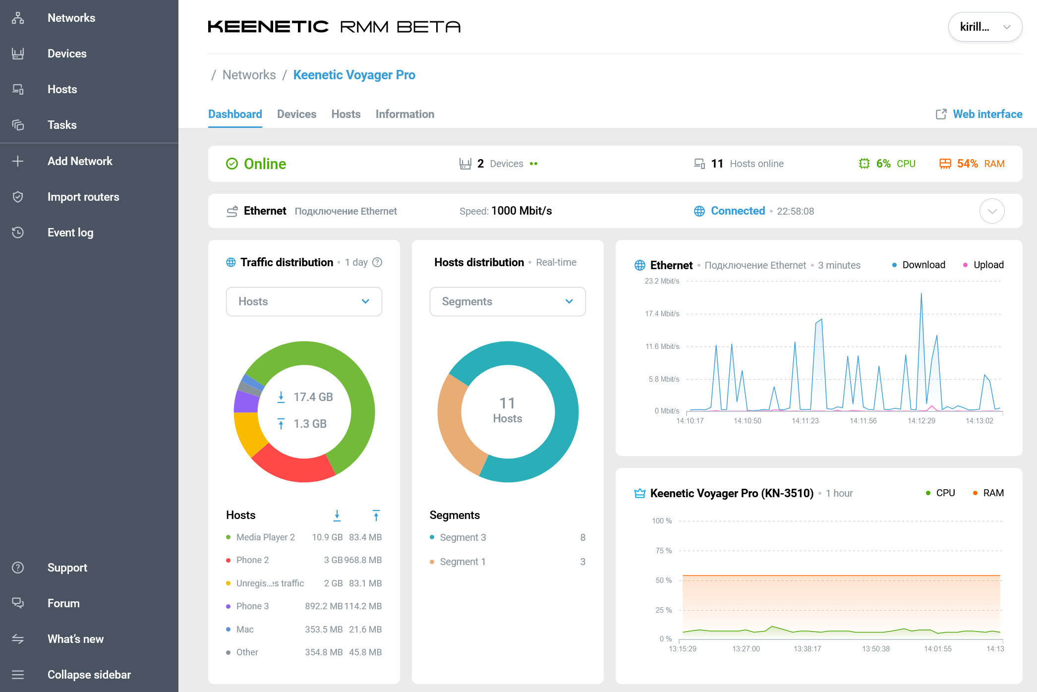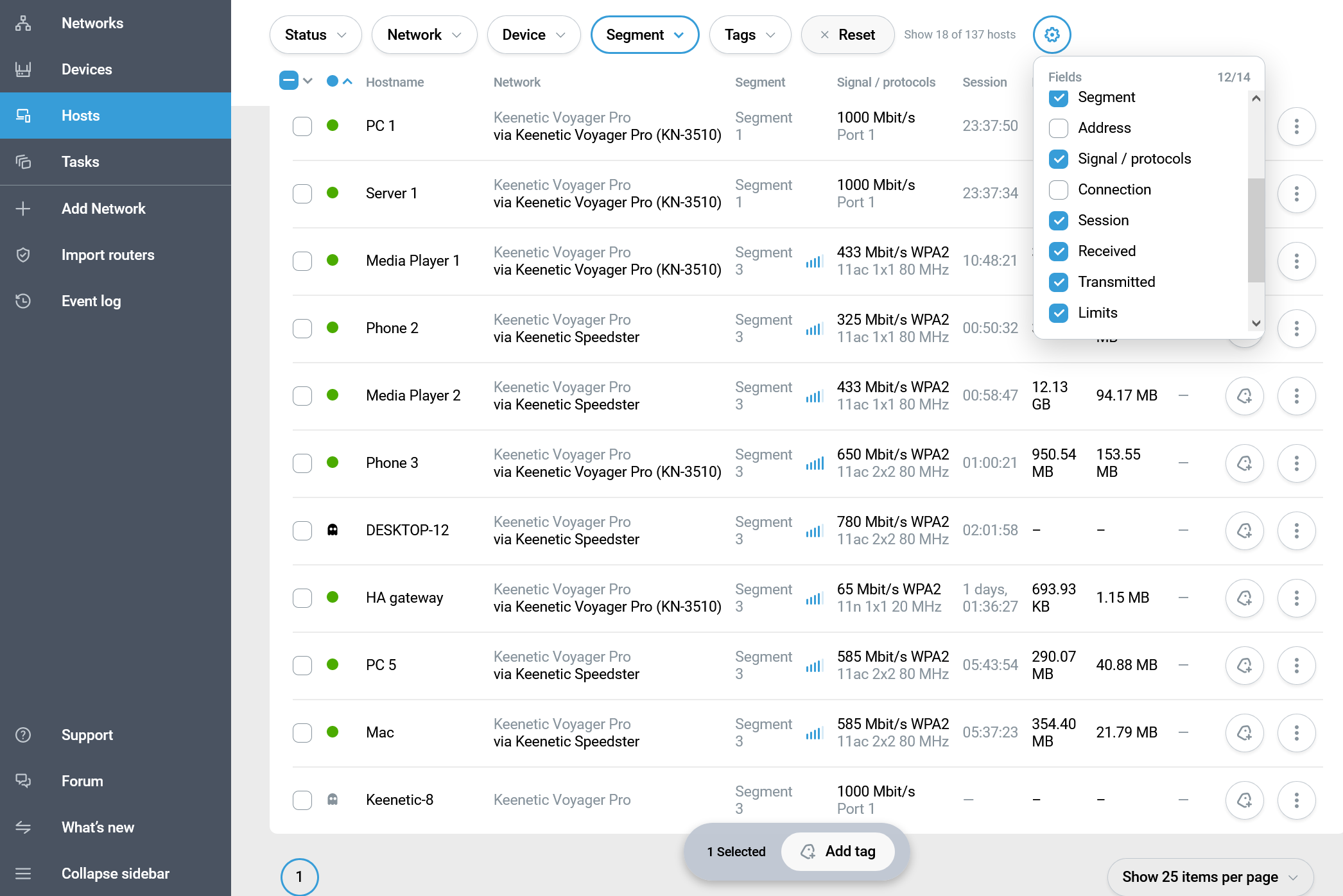 Следующий пункт — «Hosts». Это общий по всем сетям список клиентов. Благодаря сортировке и фильтрам, можно выбрать необходимый вариант представления данных.