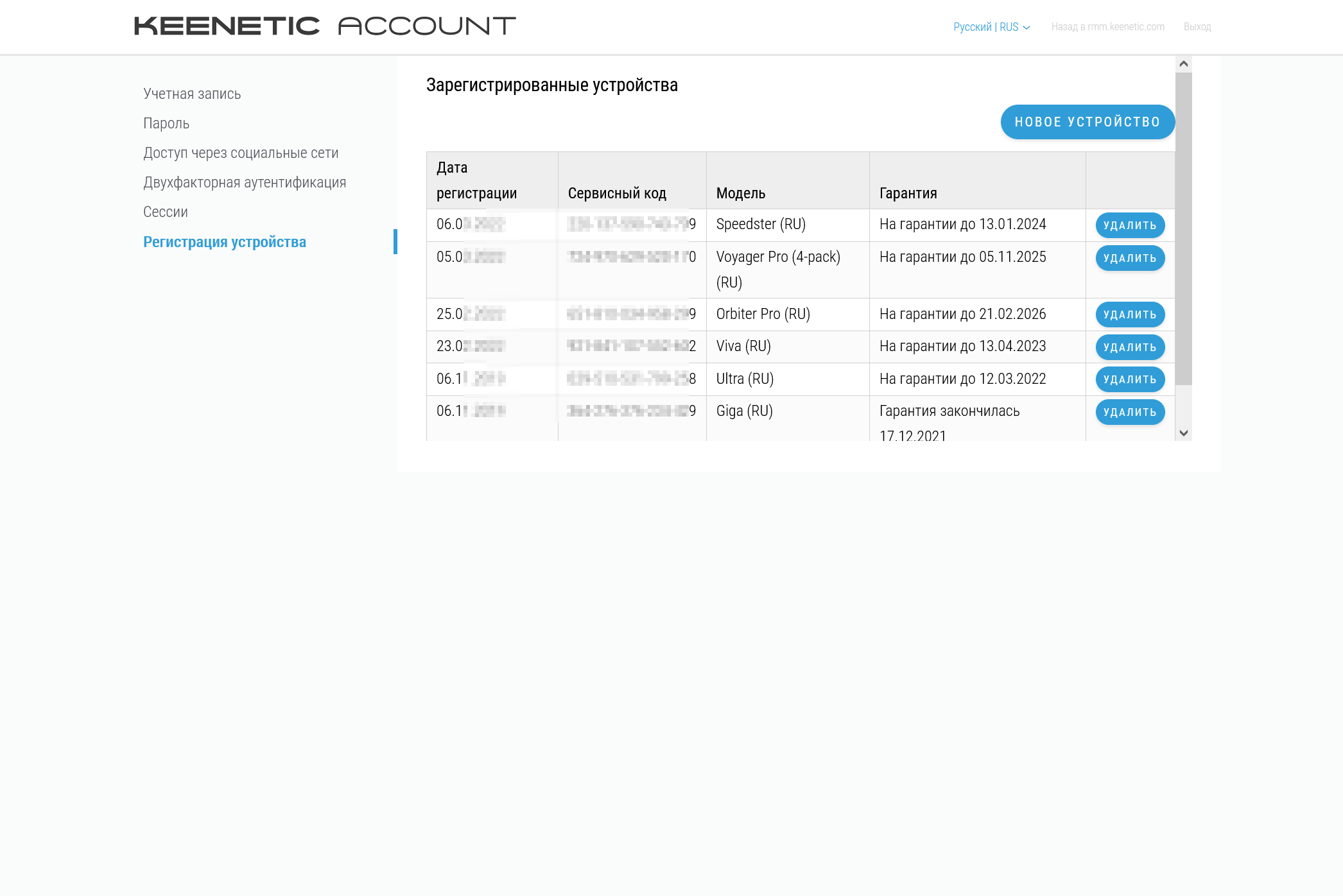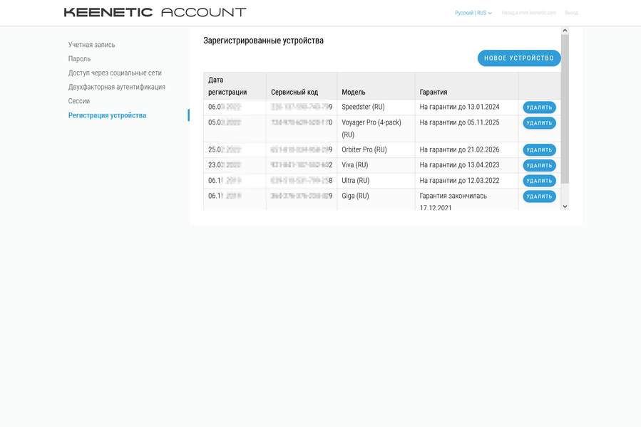 На отдельной странице представлен список текущих подключенных к аккаунту устройств с указанием даты регистрации, сервисного кода, модели и статуса гарантии. Здесь же можно и добавить новое устройство в аккаунт.