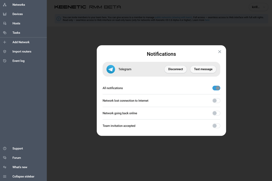 Последнее, что стоит здесь упомянуть, — система уведомлений через Telegram. Работает все с использованием фирменного бота и сейчас умеет присылать сообщения в случае пропадания/восстановления связи с сетями, а также при принятии приглашения новым пользователем.