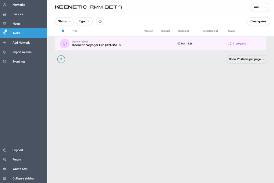На странице «Tasks» отображается статус созданных на странице «Devices» операций. Как и в других таблицах, здесь есть выбор столбцов, фильтры и сортировки.