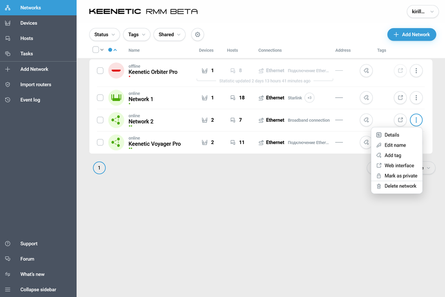 Сам интерфейс RMM сейчас есть только на английском языке. На первой после входа в систему странице представлен общий список всех доступных пользователю «Сетей». Каждый такой объект может включать в себя несколько устройств (роутер плюс дополнительные узлы Mesh-сети). Плюс в таблице представлено число клиентов в сети, подключение, пользовательские теги и другие данные. Внешний вид можно менять, а также ставить фильтры для более удобного отображения данных. Прямо из этой таблицы можно перейти и к веб-интерфейсу главного устройства в сети. При этом данный сервис работает независимо от настроенного на роутере KeenDNS и также с использованием https и официального сертификата.