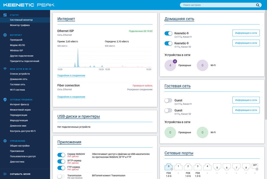 Учитывая большой объем оперативной и флеш-памяти, никаких ограничений по использованию многочисленных дополнительных программных пакетов в Keenetic Peak KN-2710 нет. Поддержка внешних устройств, включая накопители, модемы, фирменные адаптеры для DSL и телефонии, также на месте. Конечно, реализованы и все онлайн-сервисы, включая доменные имена, SSL-сертификаты, облачный доступ, мобильное приложение и так далее.