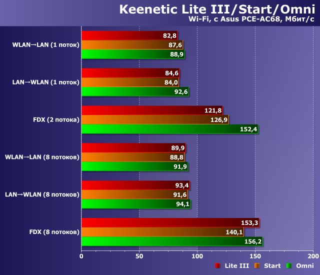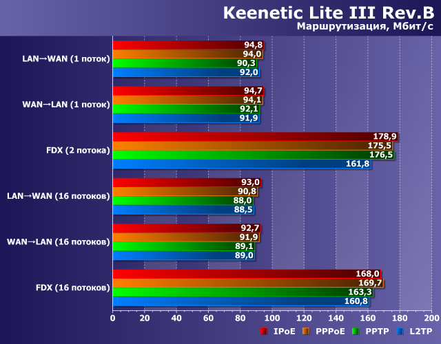 Тестирование проводилось на прошивках версии 2.11.C.1.0-3. В сравнении участвовала также модель Lite III Rev. B прошлого поколения. Начнем, как обычно, с проверки скорости работы в основном сценарии — маршрутизации с разными типами подключения к интернету.