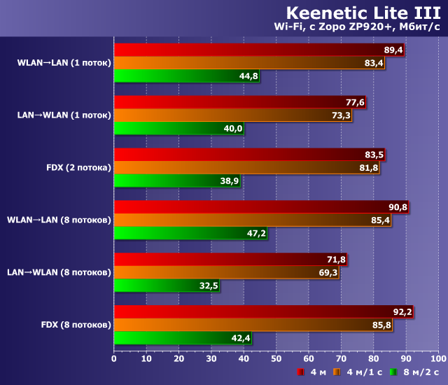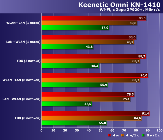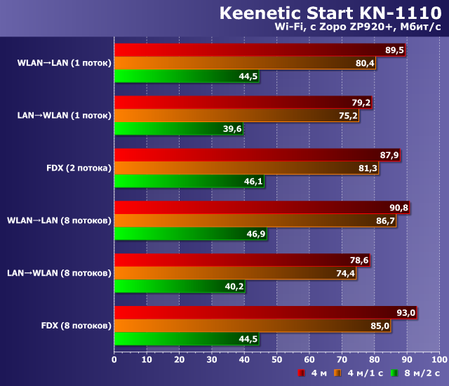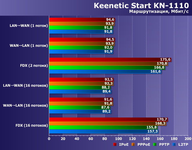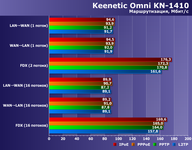 Как мы видим, все устройства обеспечивают во всех режимах максимальную для своей конфигурации портов производительность на уровне 90 Мбит/с. Так что можно говорить о том, что даже недорогие модели Keenetic способны обеспечить доступ к интернету большинству потребителей без компромиссов со скоростью.