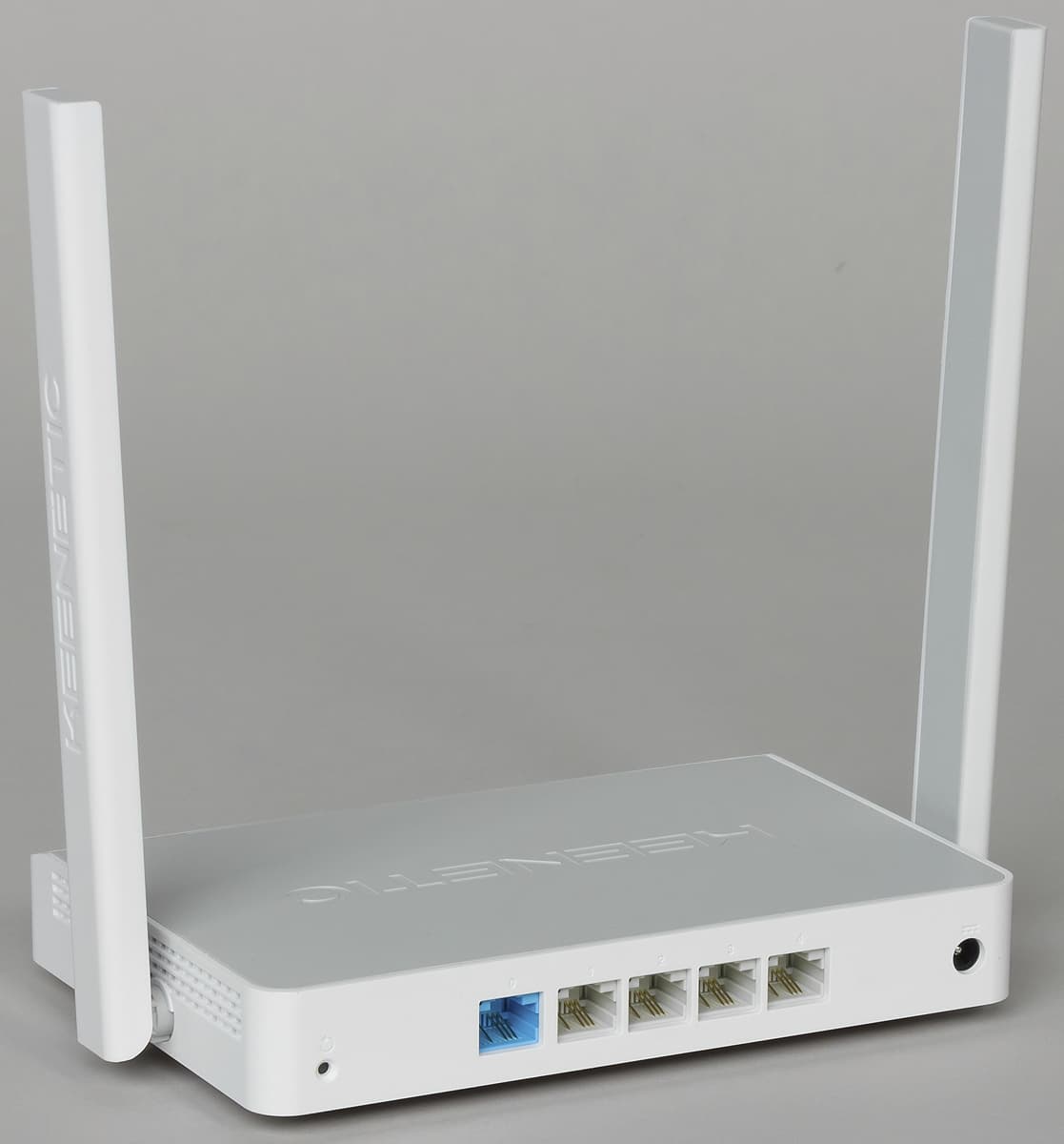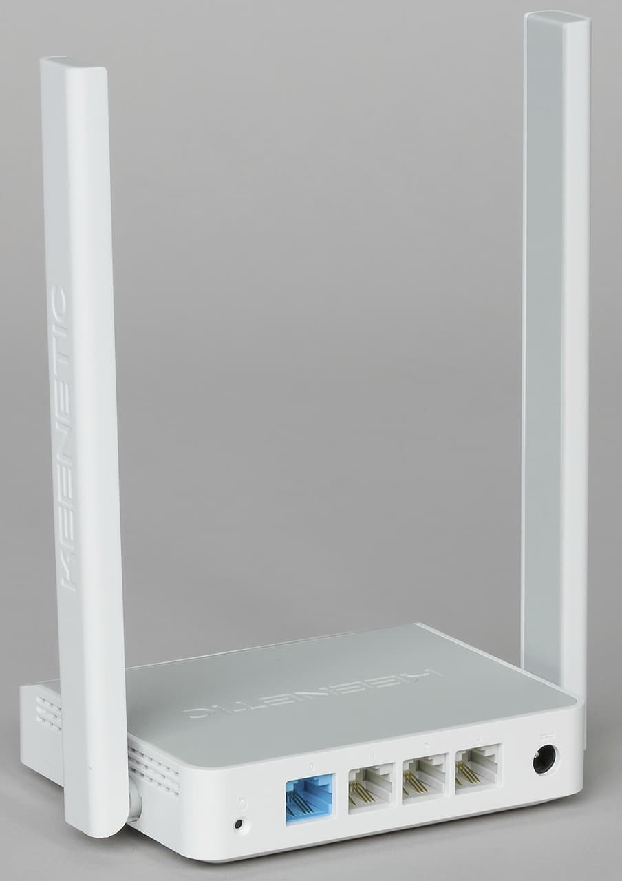 Сзади находится скрытая кнопка сброса, четыре проводных порта без индикаторов и вход блока питания. Выключателя питания в данном устройстве не предусмотрено. Напомним, что проводные порты в Keenetic могут выполнять любые роли благодаря возможности программирования их функций. Так что схема 1×WAN+3×LAN является достаточно условной. Также обратим внимание, что в модели Keenetic Start с проводным подключением к интернету можно иметь не более трех проводных клиентов локальной сети (без применения дополнительного оборудования). Конечно, большинству потребителей этого будет вполне достаточно, но все-таки стоит иметь ввиду, что более распространена конфигурация 1×WAN+4×LAN.