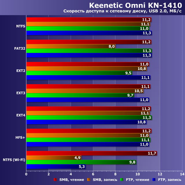 Роутер Keenetic Omni KN-1410 дополнительно оборудован портом USB 2.0, который, среди прочего, может использоваться для подключения внешних накопителей с целью организации общего сетевого доступа к файлам. Конечно, учитывая аппаратные характеристики устройства, сложно говорить о комфортной работе с файлами большого размера по сети, но для резервного копирования важных документов или предоставления доступа к файлам через интернет (благодаря серверу FTP), решение вполне может подойти.