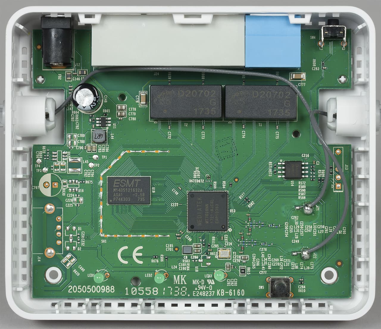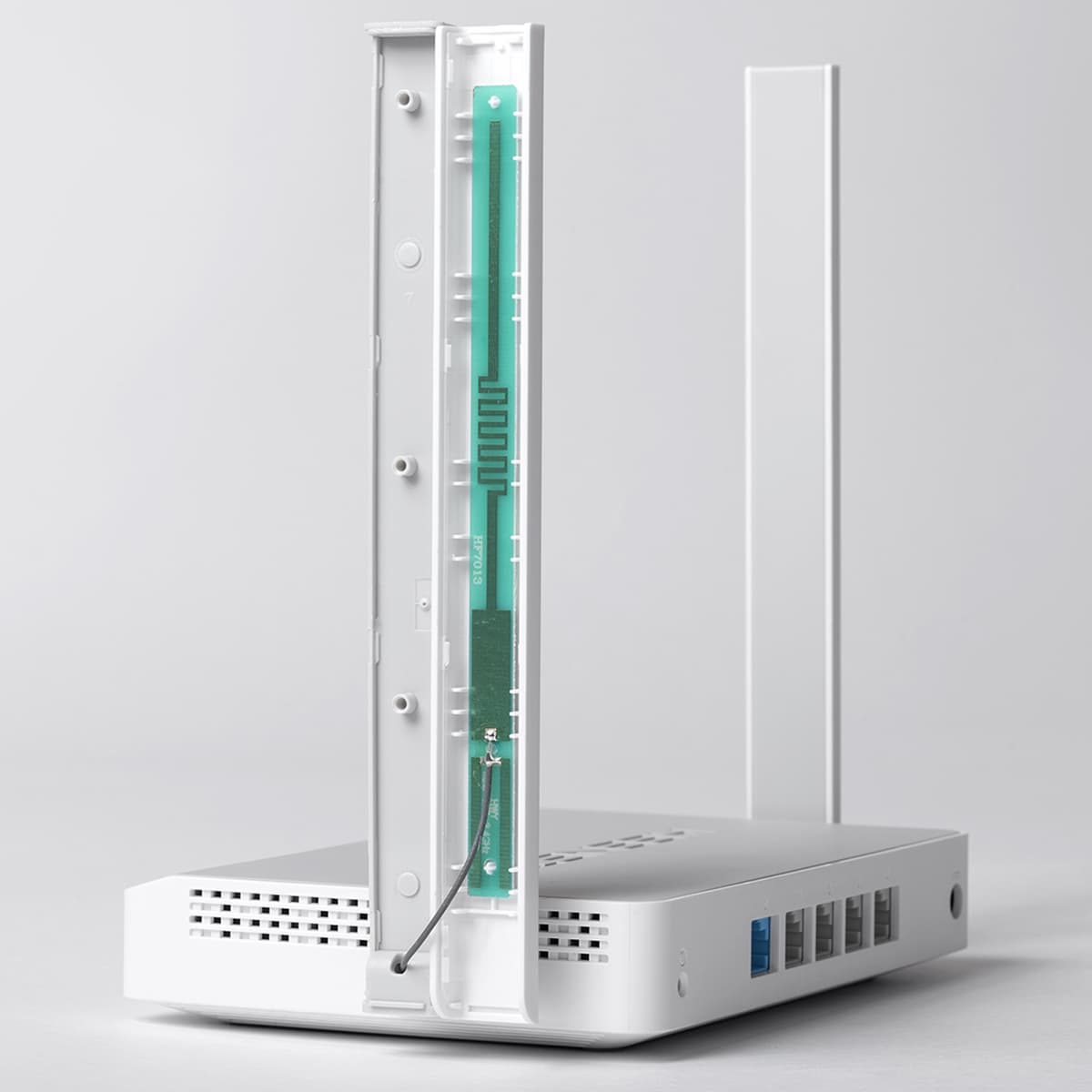 Антенны в данной модели (точнее во всей линейке) несъемные. При этом они имеют две степени свободы. Выполнены антенны в формате печатной платы, что, по словам производителя, обеспечивает более высокую эффективность работы по сравнению с традиционными вариантами. Размеры антенн достаточно велики — 176×19×9 мм и стоит учитывать это при выборе места установки.