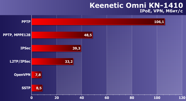 Как мы говорили выше, с точки зрения возможностей программного обеспечения устройства не уступают и старшим моделям. В частности, в них реализованы серверы VPN, которые могут помочь организовать безопасный удаленный доступ к вашей домашней сети. Тестирование сценария проводилось в режиме IPoE-подключения к интернету на четырех потоках (два на прием и два на передачу). Проверялись серверы PPTP, L2TP/IPSec, IPSec, OpenVPN и SSTP. Для всех, кроме OpenVPN, применялись штатные клиенты Windows 10 (особенности их настройки описаны в статьях базы знаний на сайте производителя). Сервер SSTP в настоящий момент отсутствует в релизной ветке прошивок, так что для него использовалась версия 2.12. Для теста применялся роутер Keenetic Omni KN-1410.