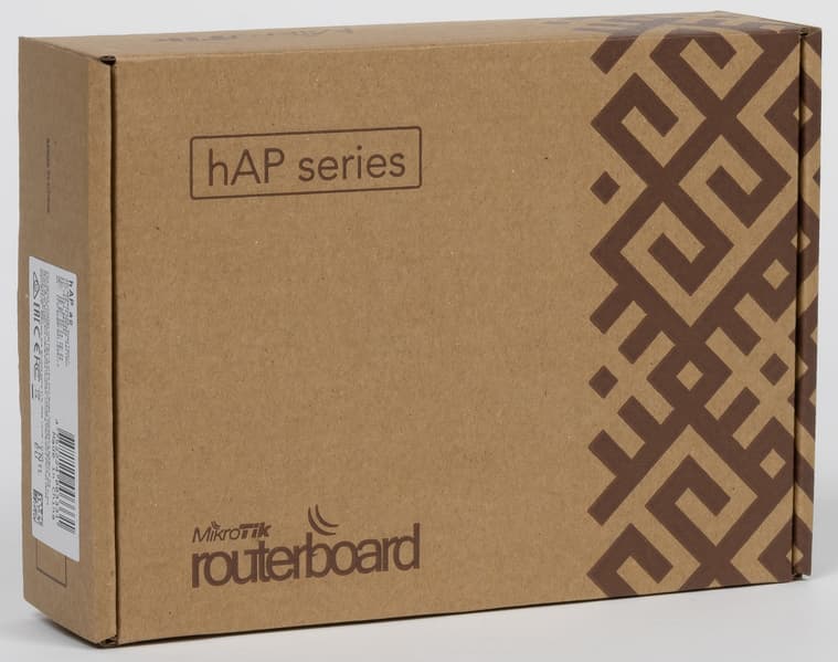 Поставляется роутер в скромной картонной коробке небольших размеров. Из полезного на ней только наклейка с артикулом, MAC-адресами и серийным номером. Небольшие габариты обусловлены использованием встроенных антенн в роутере.