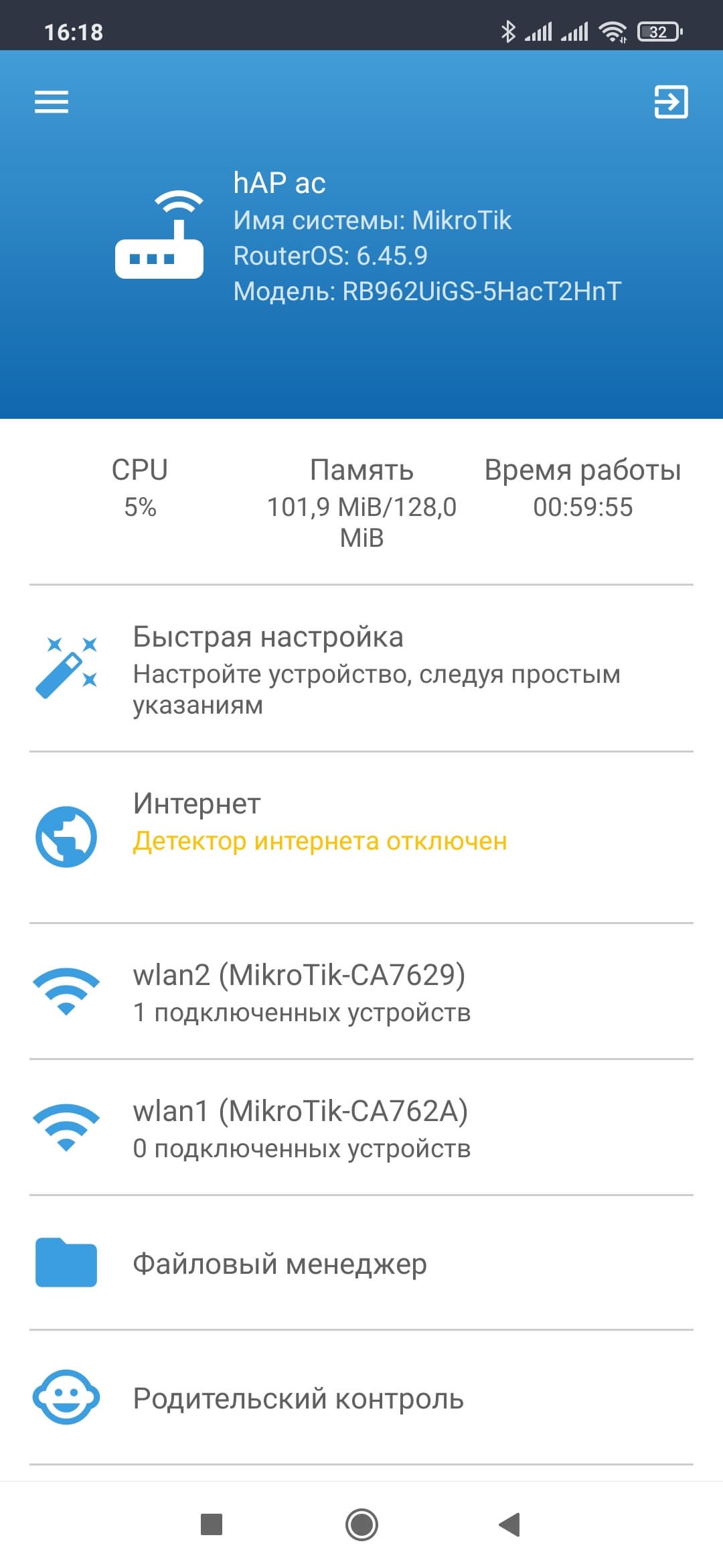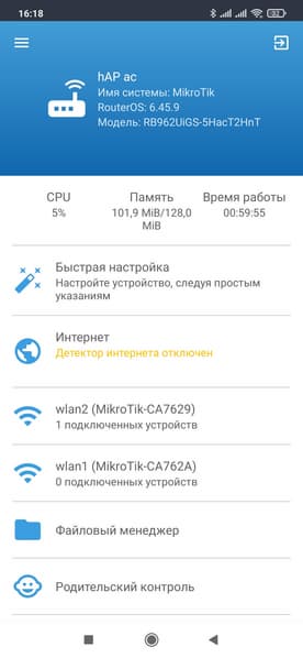 Как мы писали выше, в данной статье мы не будем детально углубляться в описание RouterOS, поскольку тема это в определенном смысле бескрайная. Так что о настройках будет сказано буквально несколько слов. Устройство поддерживает несколько вариантов доступа к конфигурации — через браузер, через фирменные программы для Windows и мобильных ОС, а также по telnet и ssh. Для разнообразия в этот раз мы начали с мобильного приложения.