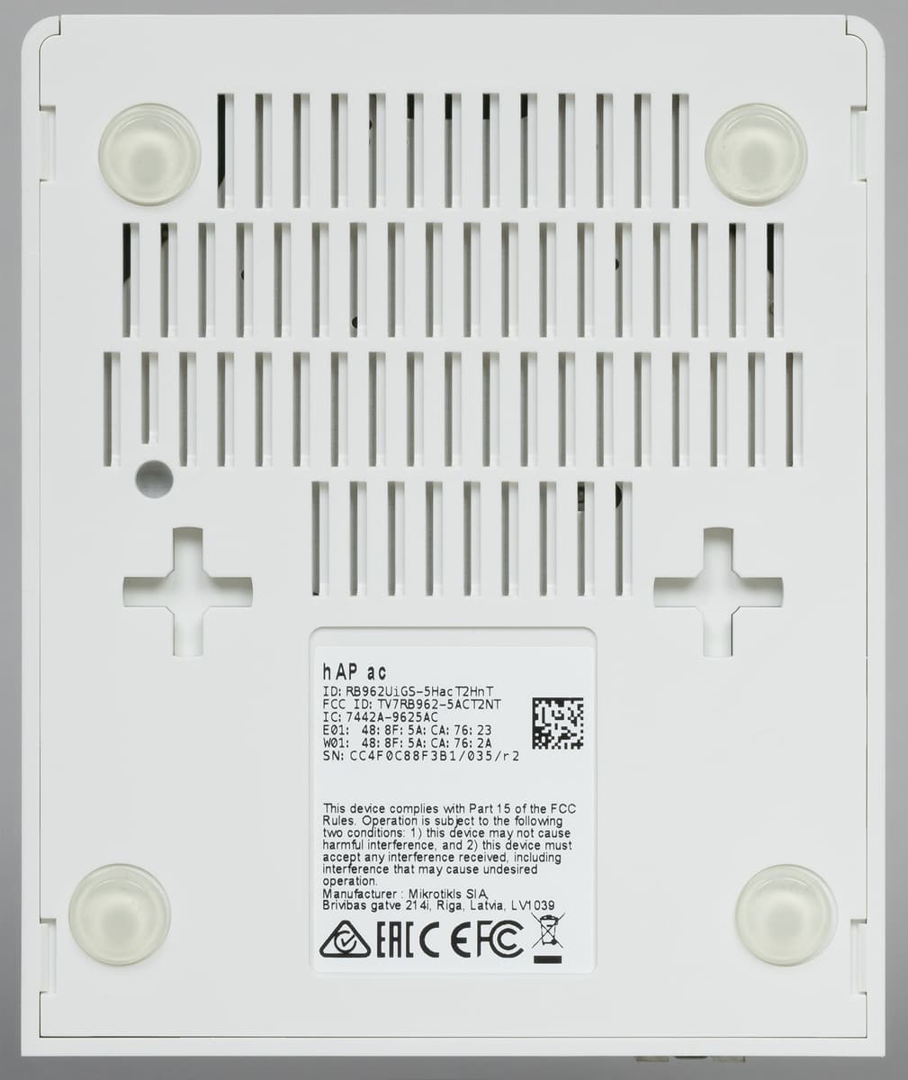 На дне есть резиновые ножки и отверстия для настенного крепления в любом положении. Здесь же присутствует наклейка с MAC-адресами и серийным номером. Судя по подписям на крышке, компания предлагает закреплять роутер на стене кабелями вниз.