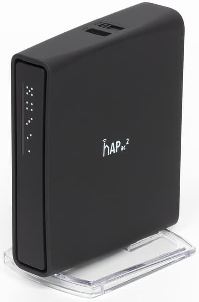Если вы привыкли выбирать себе гаджеты по внешнему виду, то Mikrotik hAP ac² вероятно вас не впечатлит — однотонный корпус из темного матового пластика с «бархатным» покрытием. Габаритные размеры 120×97×33 мм, вес — около 170 г (без подставки).
