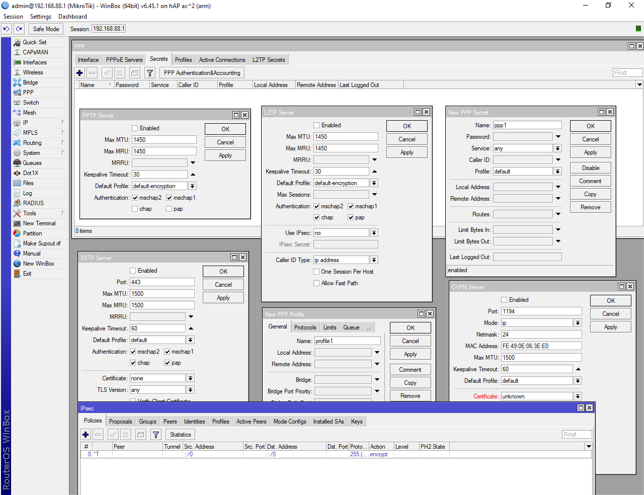 Роутер может выступать и в роли сервера VPN с поддержкой распространенных протоколов, включая PPTP, L2TP, OpenVPN, SSTP, а также IPSec.
