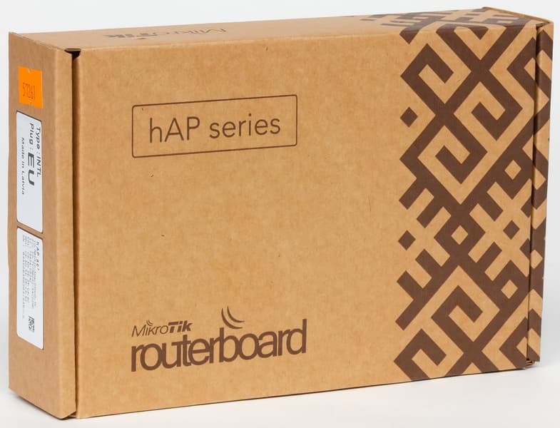 Коробка роутера очень компактная из-за использования в устройстве внутренних антенн. Выполнена она из простого, но крепкого картона. На коробке есть информационная наклейка с MAC-адресами и серийным номером устройства. Также обратим внимание на указание типа вилки блока питания.