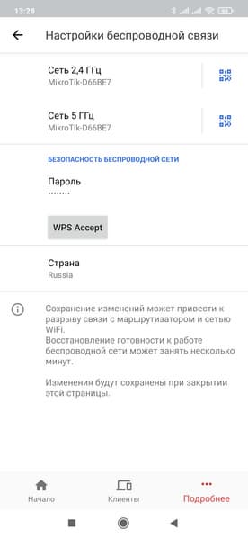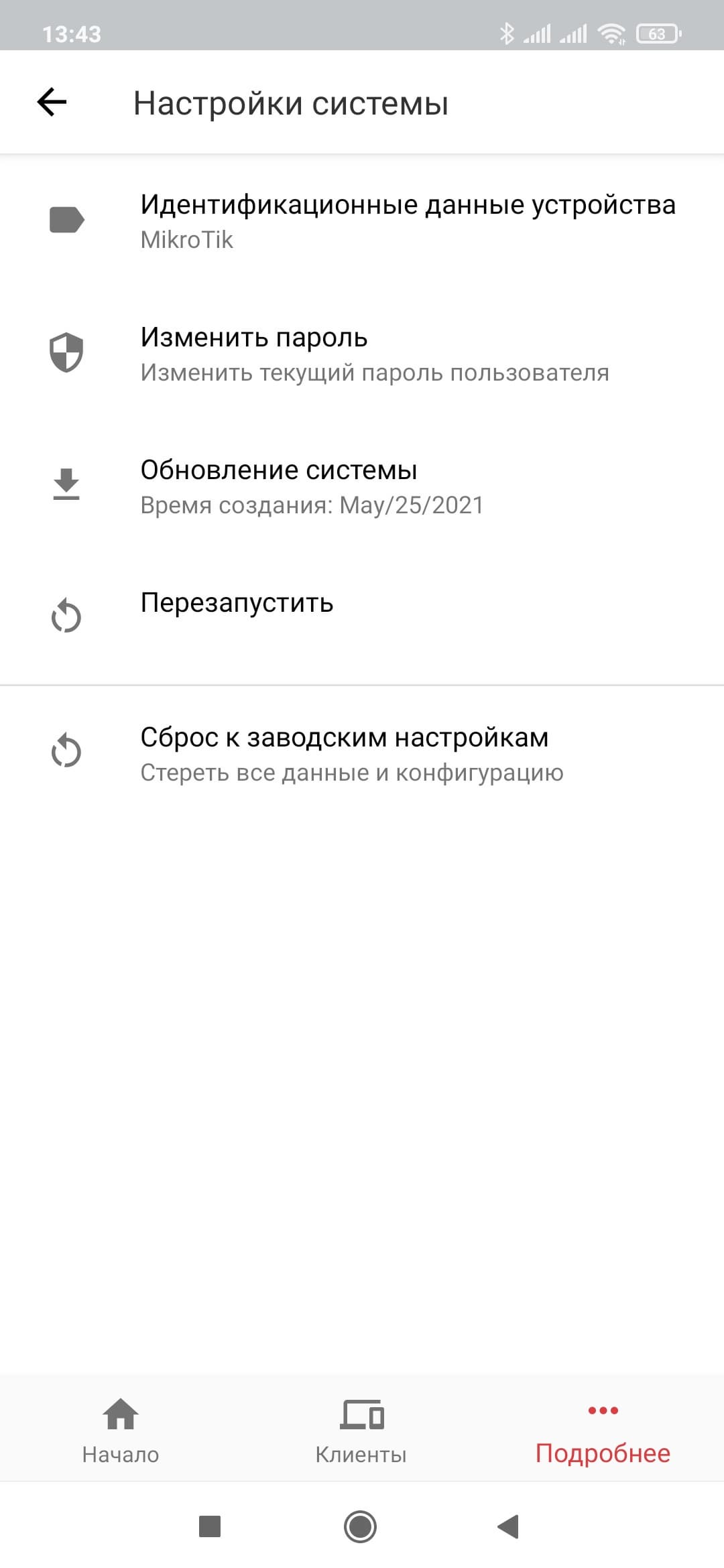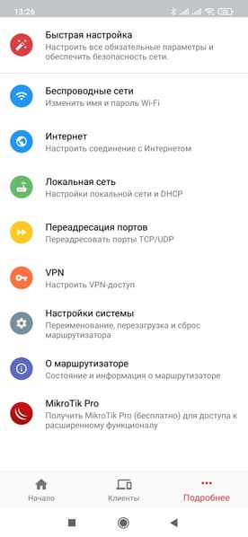 Собственно настройки собраны в меню, которое открывается в разделе «Подробнее». В отличие от полного меню в программе MikroTik Pro, здесь пунктов существенно меньше. Первым идет повторный запуск мастера настройки.