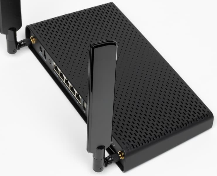 Сзади находятся разъемы для подключения антенн, вход блока питания, кнопки Reset и Mode (на вторую можно «повесить» запуск пользовательского скрипта), порт USB 2.0, пять гигабитных сетевых портов без индикаторов (если не считать светодиода PoE на пятом порту).