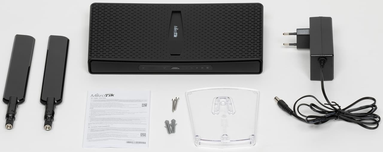 В комплект поставки входят блок питания, две съемные антенны, прозрачная подставка, два винта с дюбелями, листовка по началу работы. Блок питания имеет параметры 24 В 1,5 А и достаточно крупные размеры. Кабель длиной 1,5 м заканчивается стандартным круглым штекером. Подобные параметры скорее всего выбраны исходя из того, что было доступно. Представить себе, что роутер будет потреблять 36 Вт, непросто.