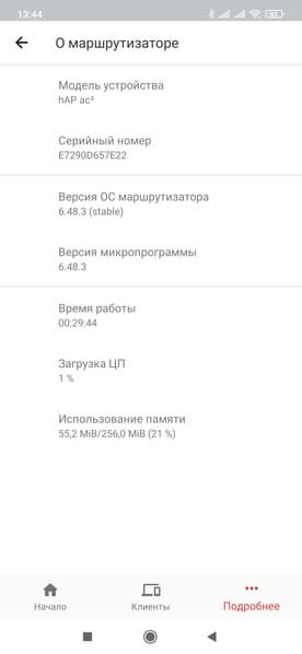 На «О маршрутизаторе» отображается модель, серийный номер, версии прошивки, время работы, загрузка процессора и оперативной памяти.