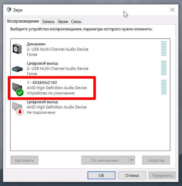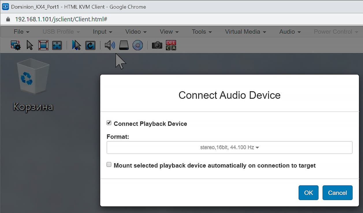 К слову о звуке: как мы уже упоминали выше, подключать его нужно отдельно, по умолчанию этого не происходит. Убедиться же в том, что звук правильно подключился к удаленному серверу можно вызвав его звуковые настройки и увидев, что звуковое устройство KVM обнаружилось и прописалось устройством по умолчанию.