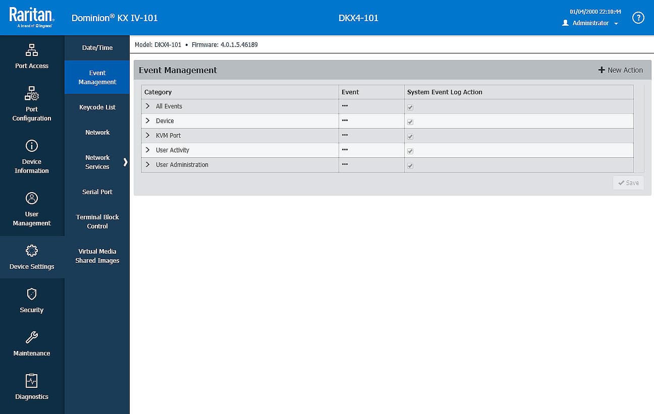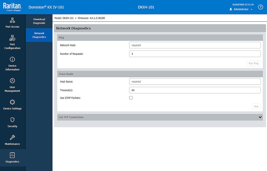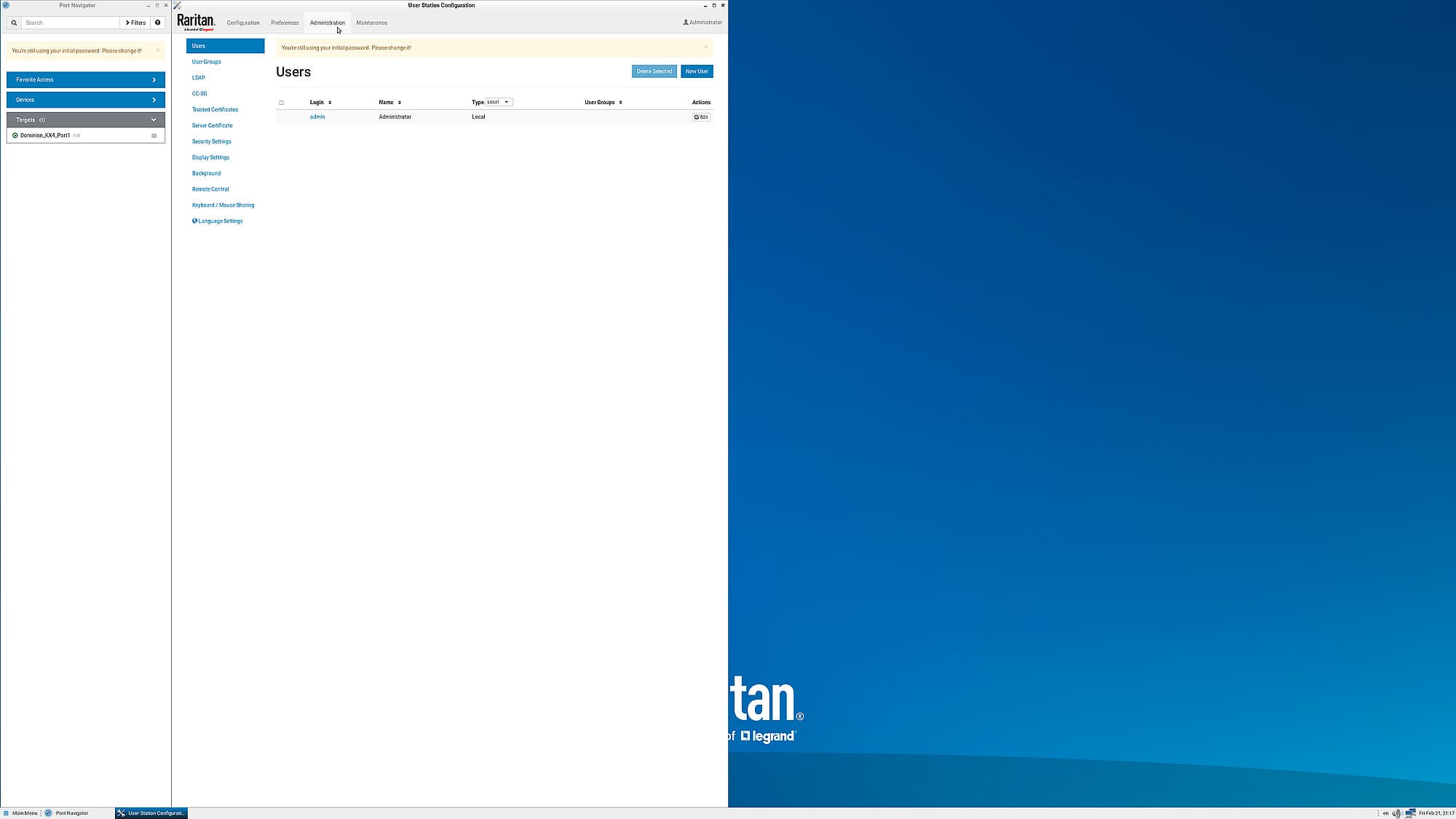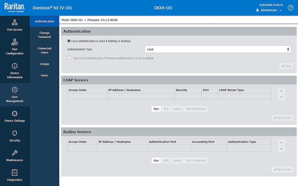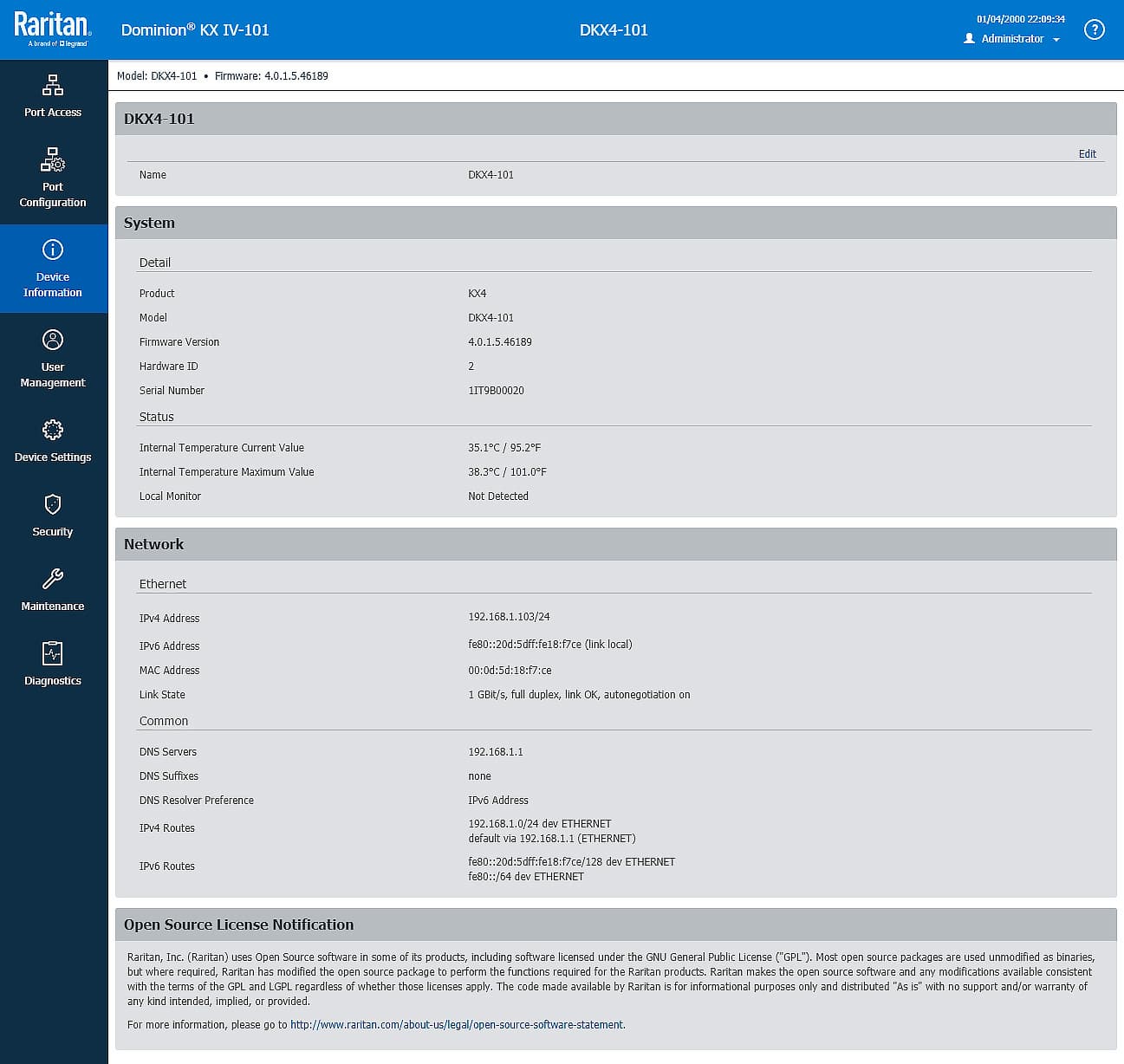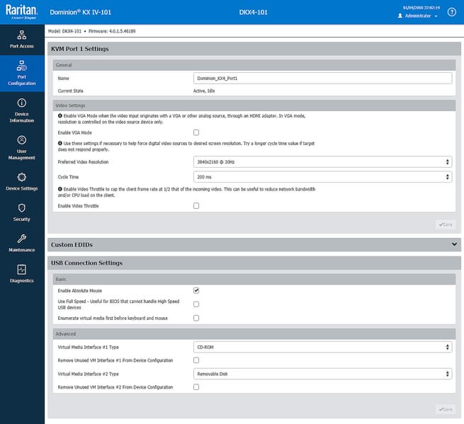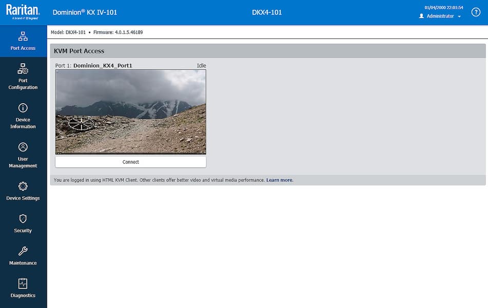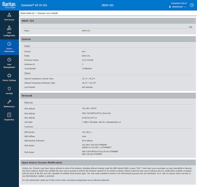 Подключившись к KX4-101 удаленно с помощью ввода выделенного ему IP в строку браузера и введя изначальные логин и пароль («admin» и «raritan», соответственно), мы попадаем в меню настроек KVM. Правда, сначала наш роутер отказался опознавать KVM, так что его пришлось вычислять методом исключения уже известных клиентов.