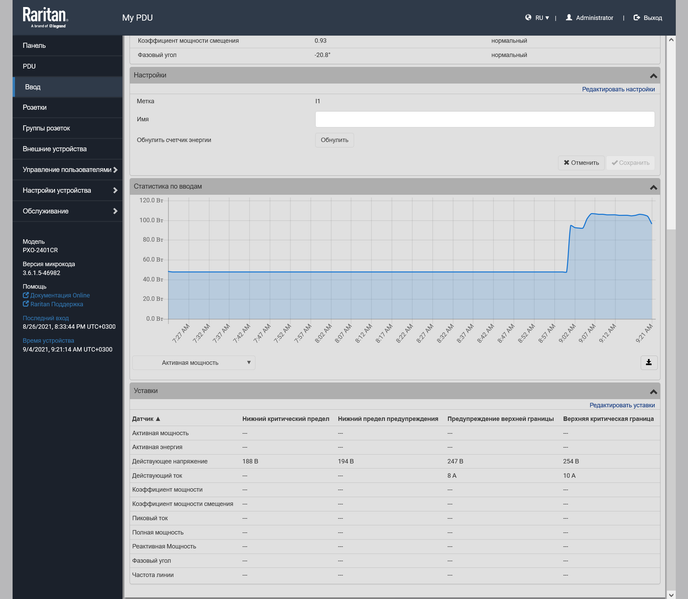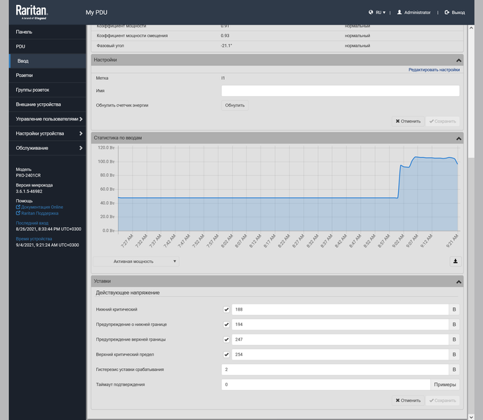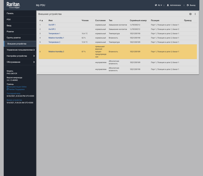 Заметим, что активные тревожные события также показываются и сменой цвета подсветки дисплея основного блока PDU. В зависимости от «серьезности», она может быть желтой или красной.