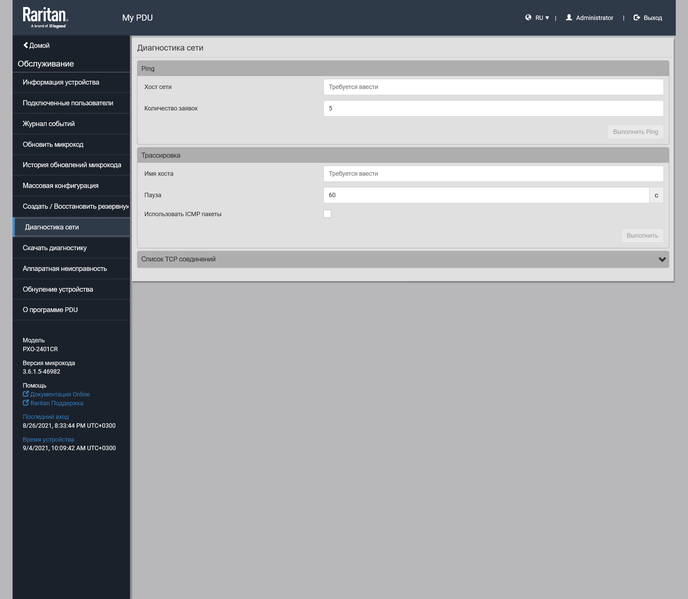 Например, на «Информация устройства» приводятся различные служебные данные об оборудовании (серийные номера, датчики, сеть и так далее), а на «Диагностика сети» представлены утилиты ping и traceroute. Отметим здесь только возможность экспорта конфигурации в текстовом формате, что удобно и может пригодиться.