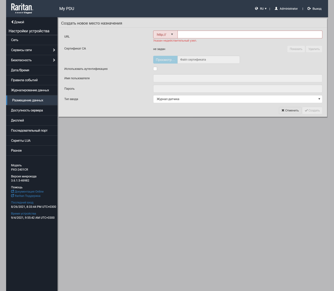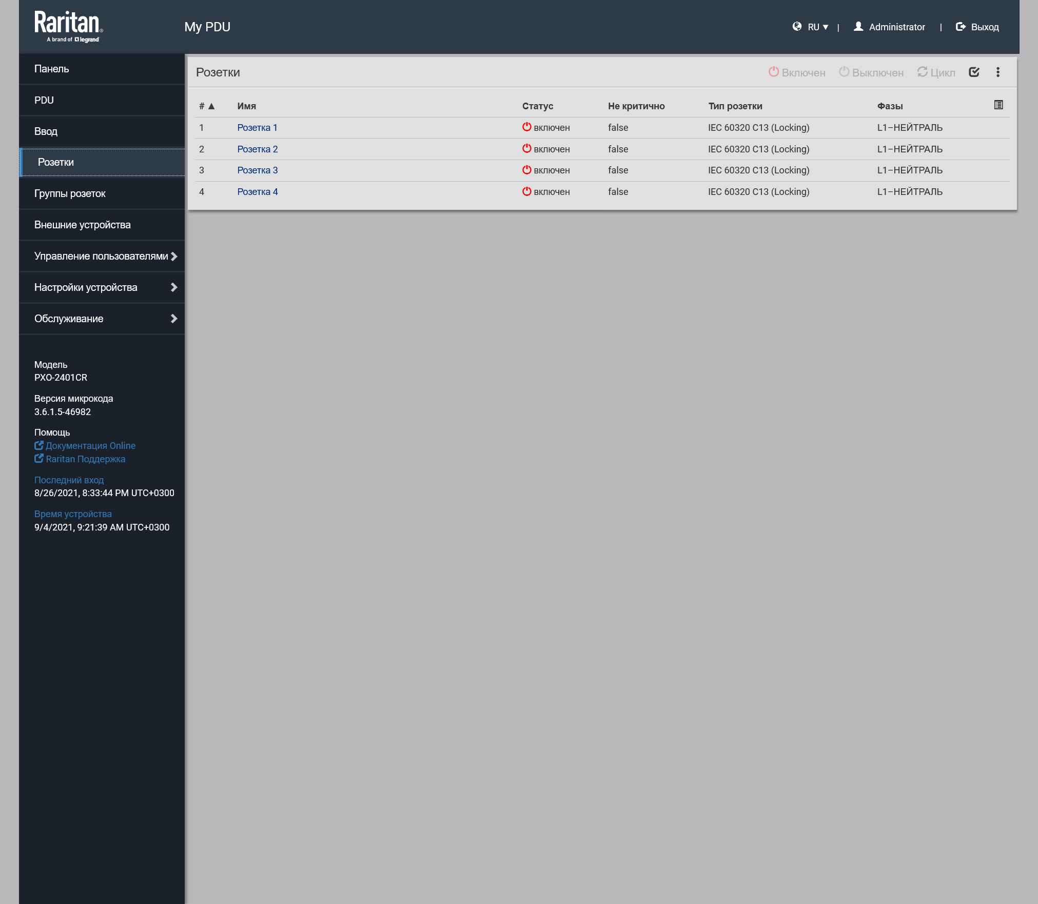 Еще одним вариантом удаленного управления является протокол SNMP (поддерживаются версии v1/v2c/v3). С его помощью можно как считывать данные, так и получать предупреждения, а также настраивать некоторые параметры PDU.