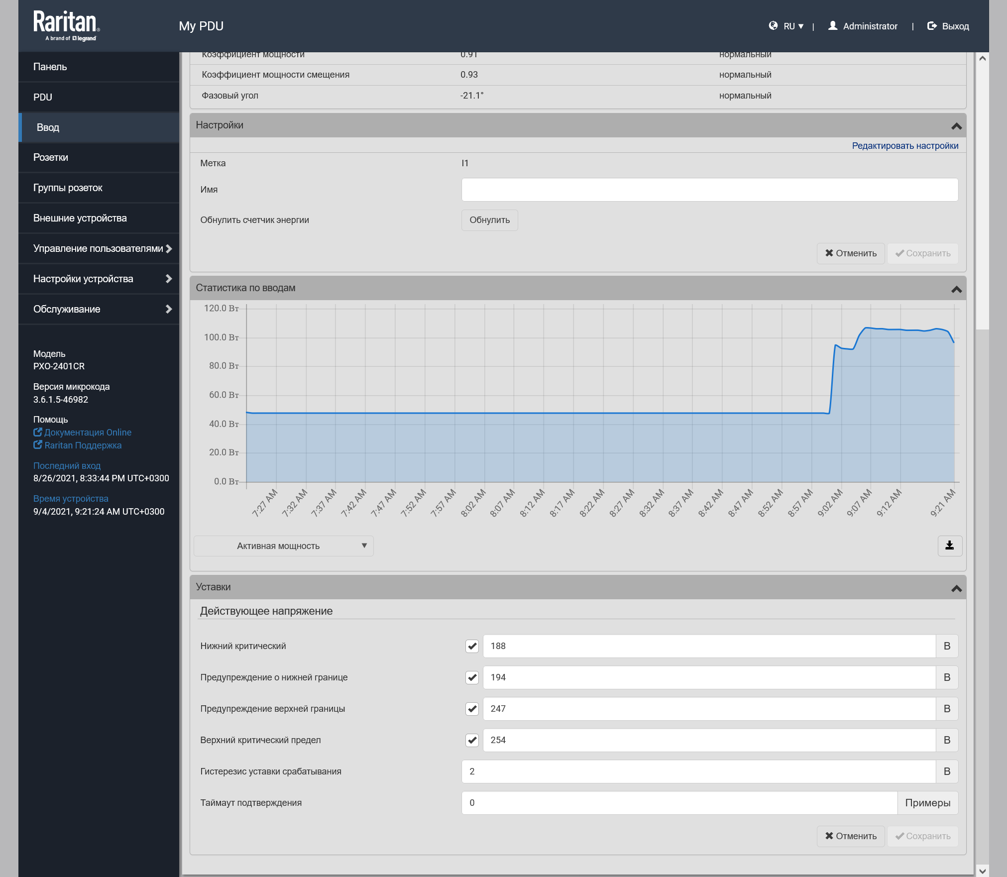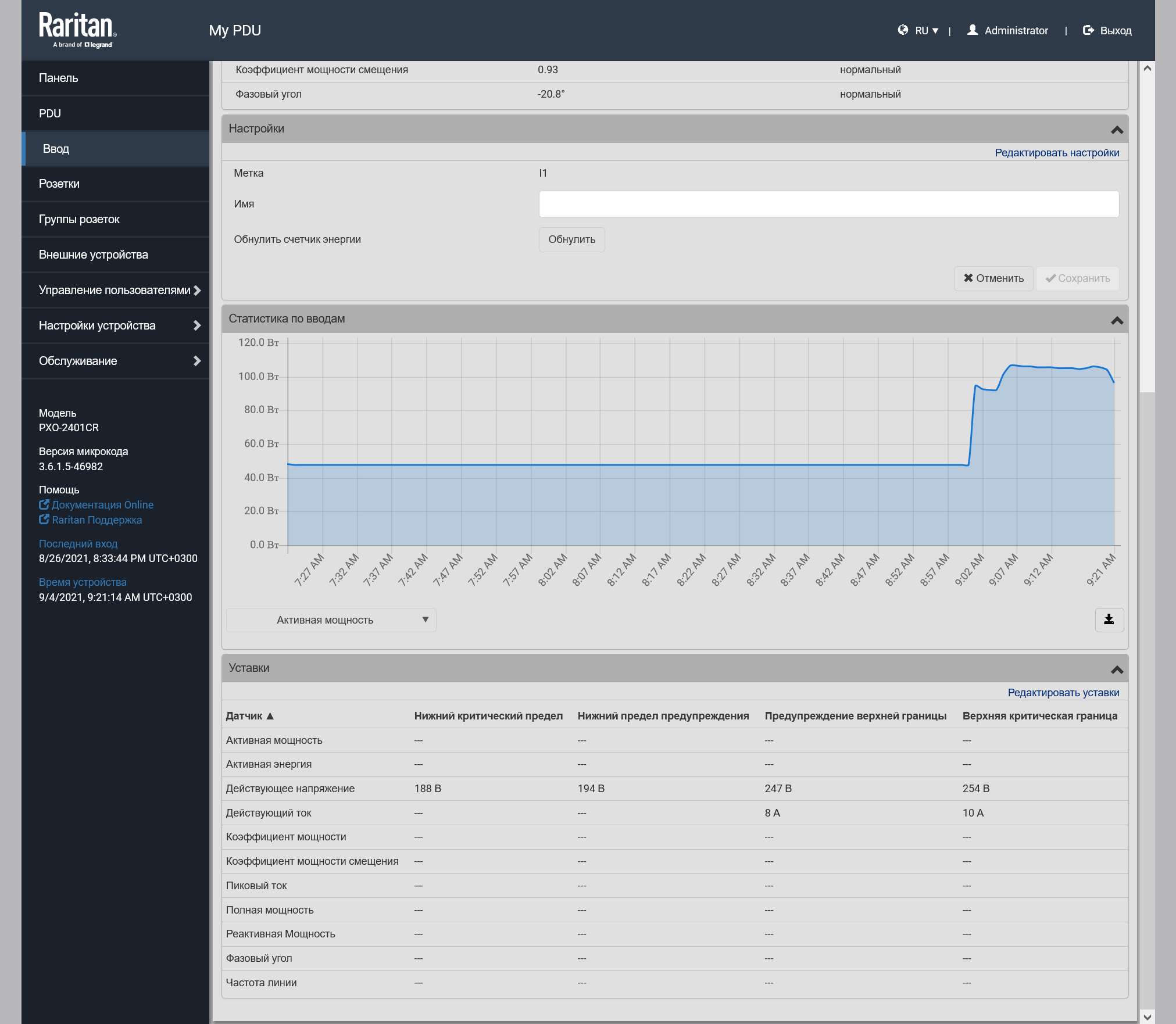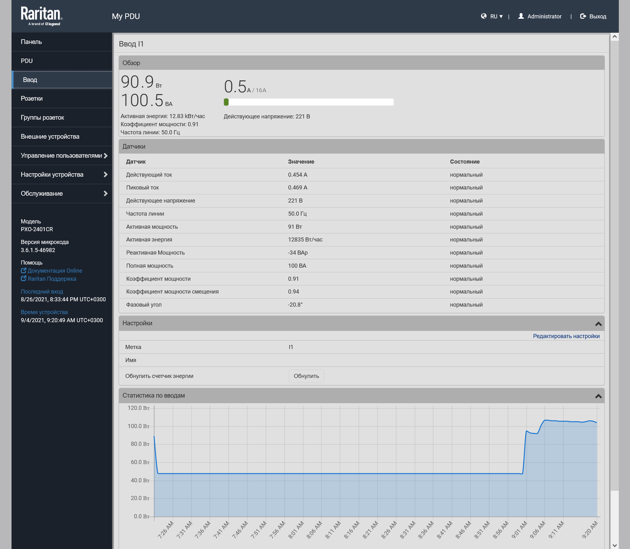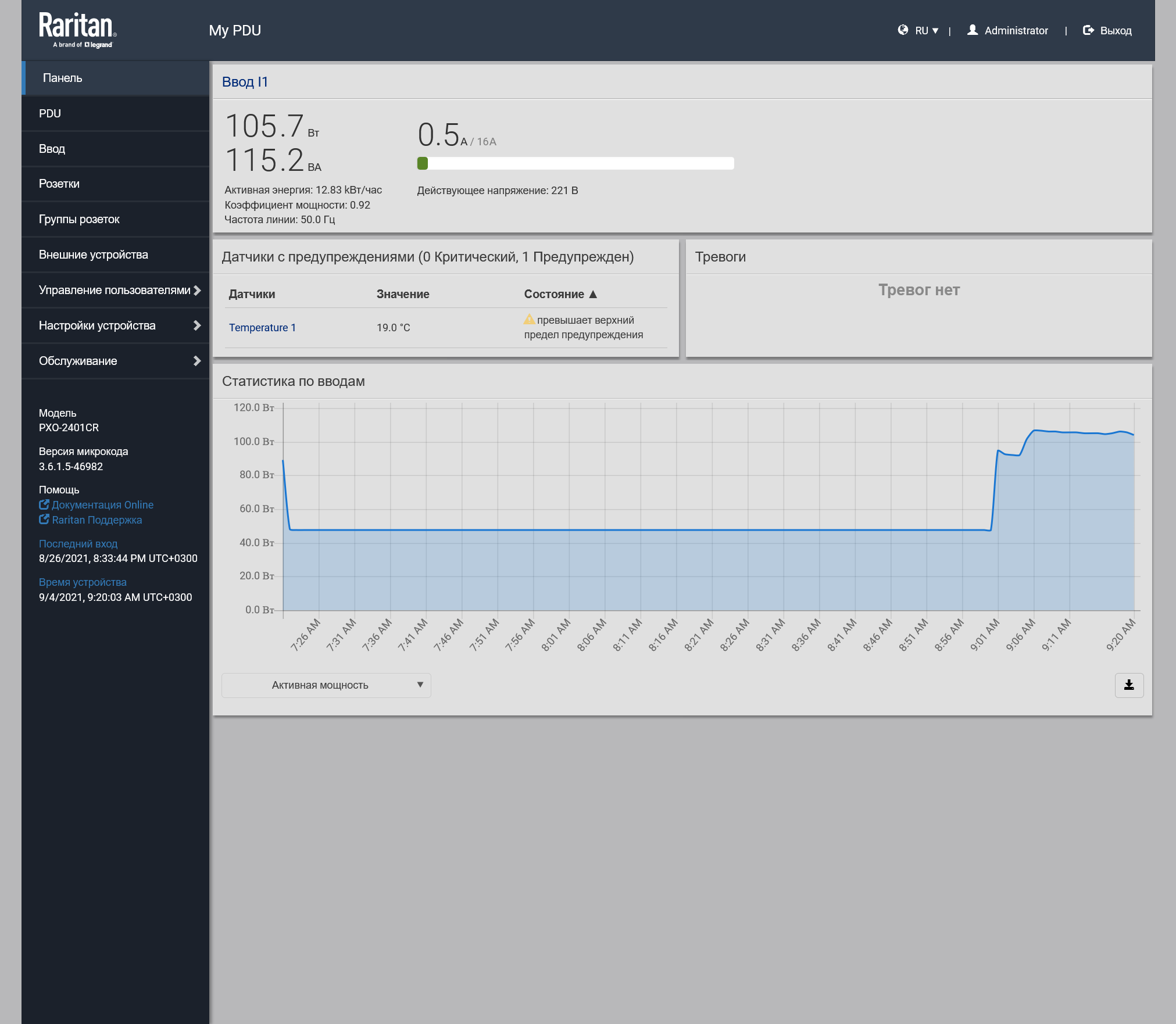 При входе пользователь попадает на экран «Панель». Здесь собрана ключевая информация о состоянии устройства: текущее потребление (в ваттах и вольт-амперах) и ток, активные предупреждения и тревоги с датчиков, графики измеряемых показателей за последние два часа.