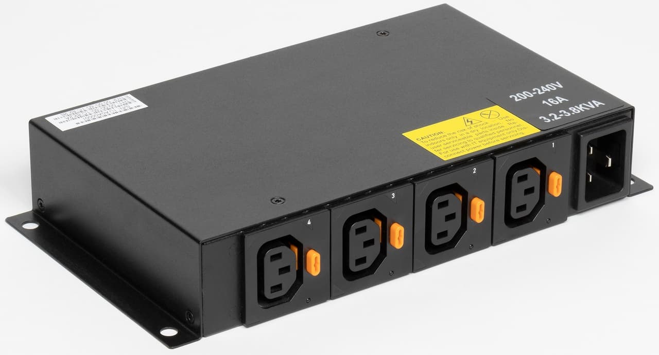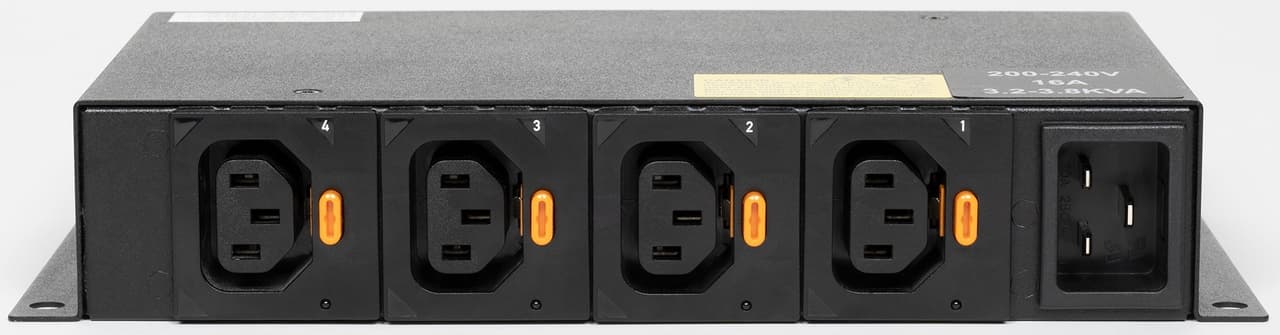 Сзади установлены вход сетевого питания C20 и четыре выхода C13 с индикаторами состояния выходов и механическими защелками, обеспечивающими надежное удержание разъемов. Отметим, что защелки работают с любыми кабелями.