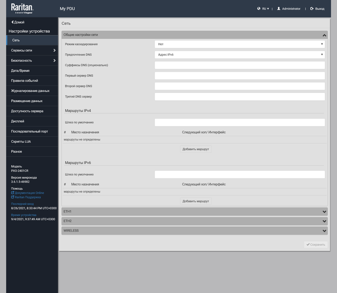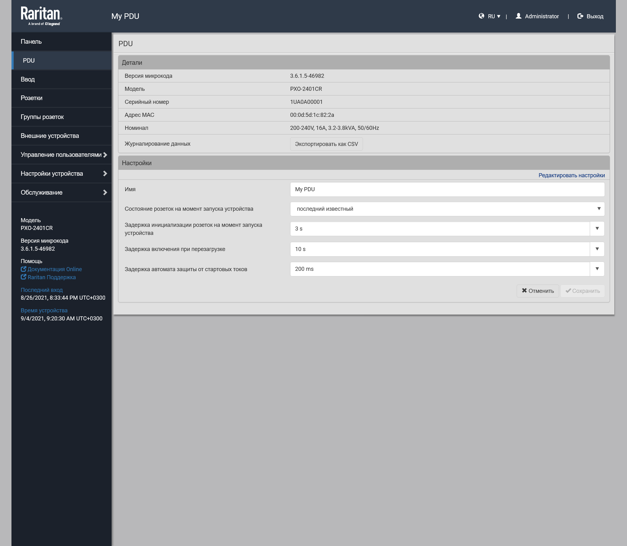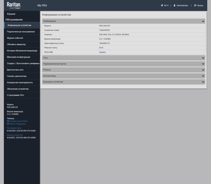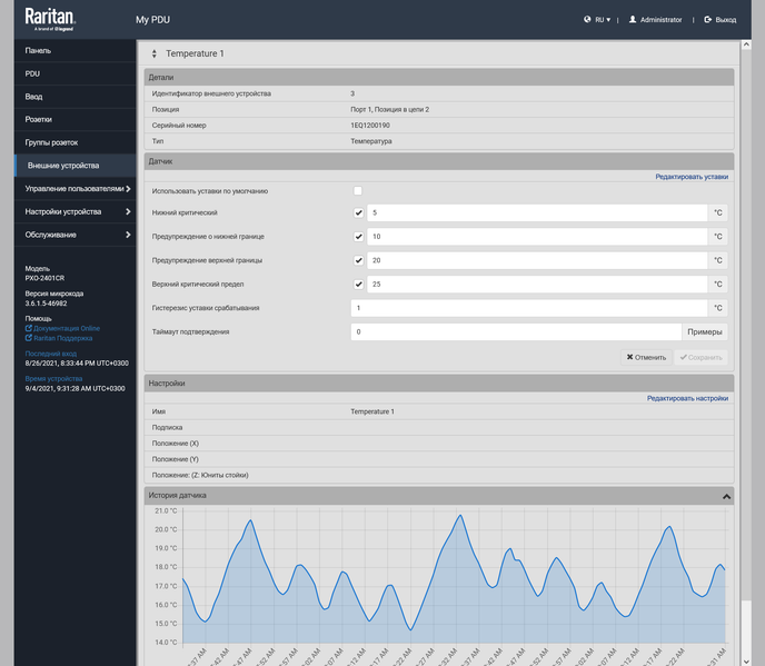 На странице PDU, кроме модели и версии прошивки, также есть такая информация как серийный номер и основной MAC-адрес. Несколько неожиданно встретить здесь же кнопку для экспорта данных мониторинга, включая показания внешних датчиков.