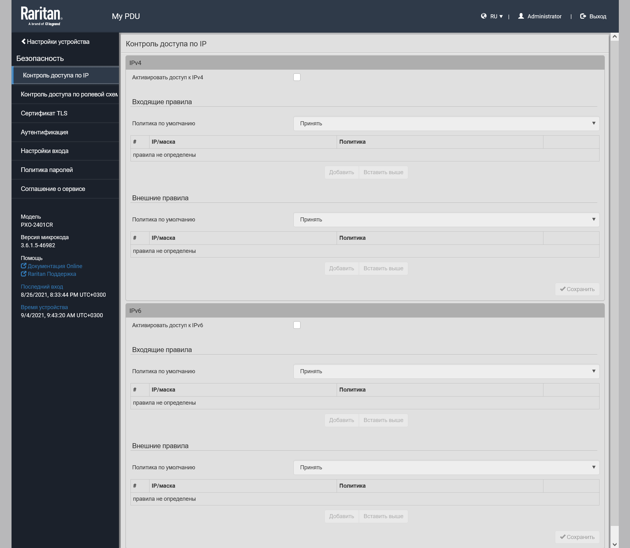 Много внимания уделяется и безопасности доступа. Предусмотрены фильтры по IP, включая вариант с привязкой к ролям, настройки сертификатов, подключение к серверам LDAP или RADIUS, защита от подбора пароля, установка требований к сложности паролей.