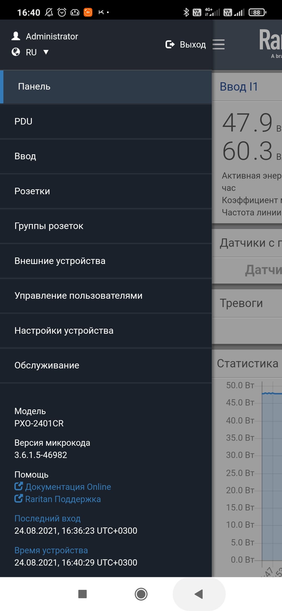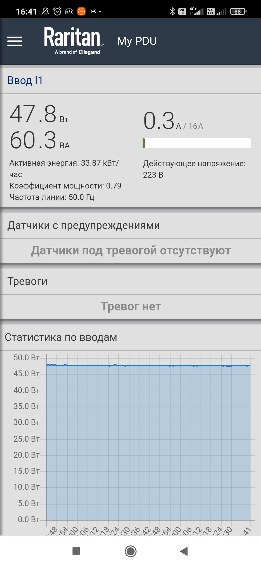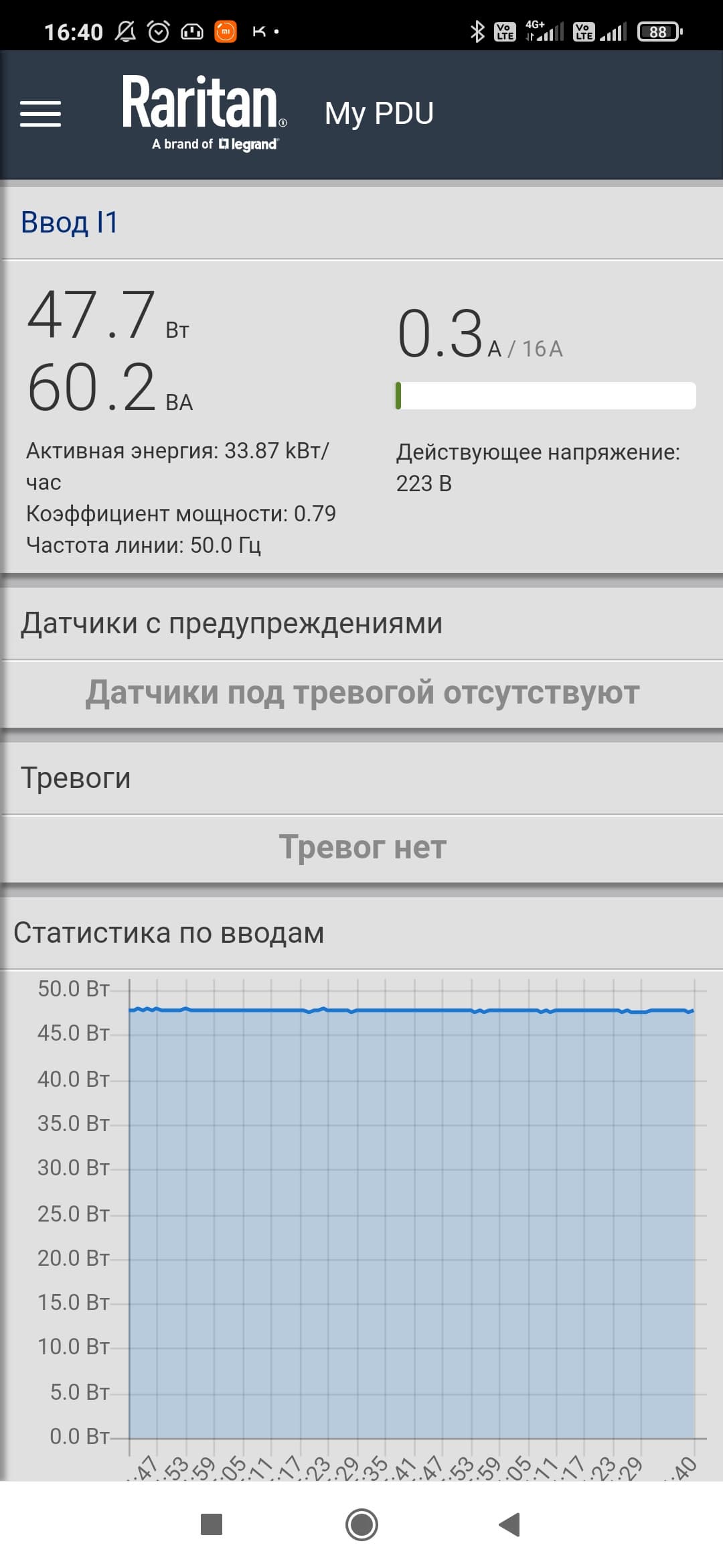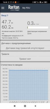 В штатном режиме работы на экране отображаются основные данные мониторинга (напряжение, ток, потребляемая мощность и другие). При наличии активных тревог, включая выход показаний датчиков из установленных пределов, именно эта информация будет отображаться на экране.
