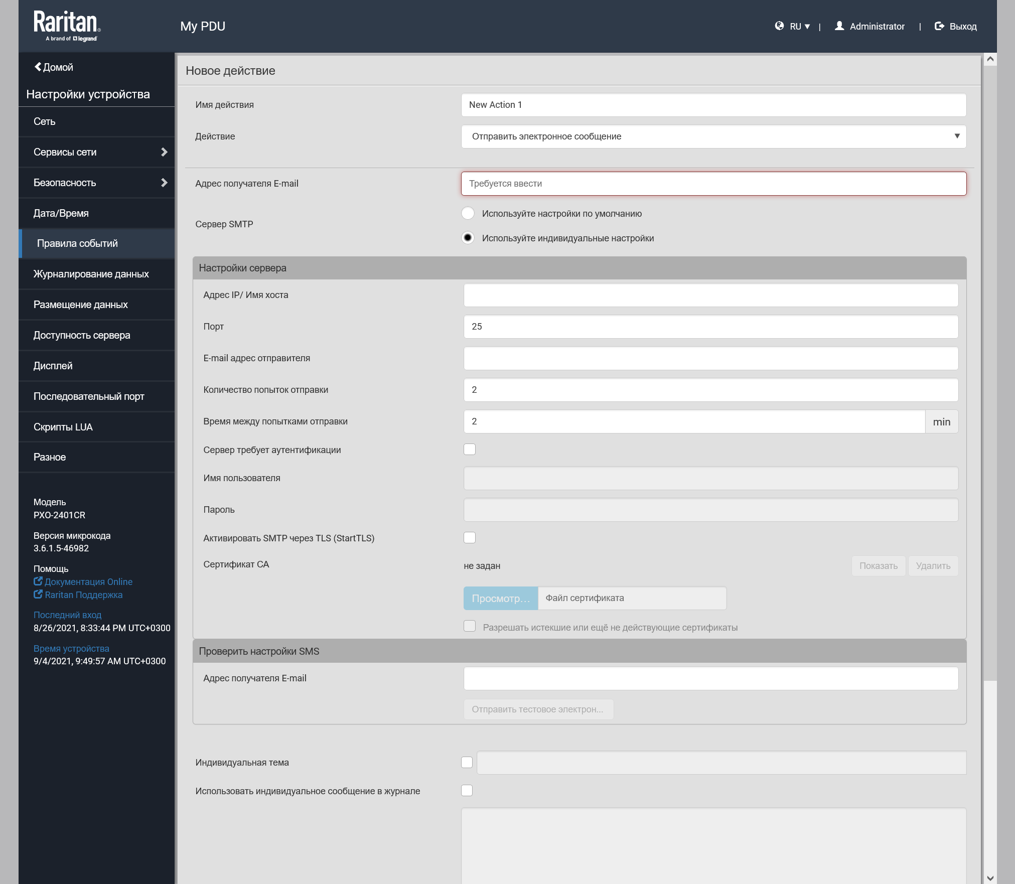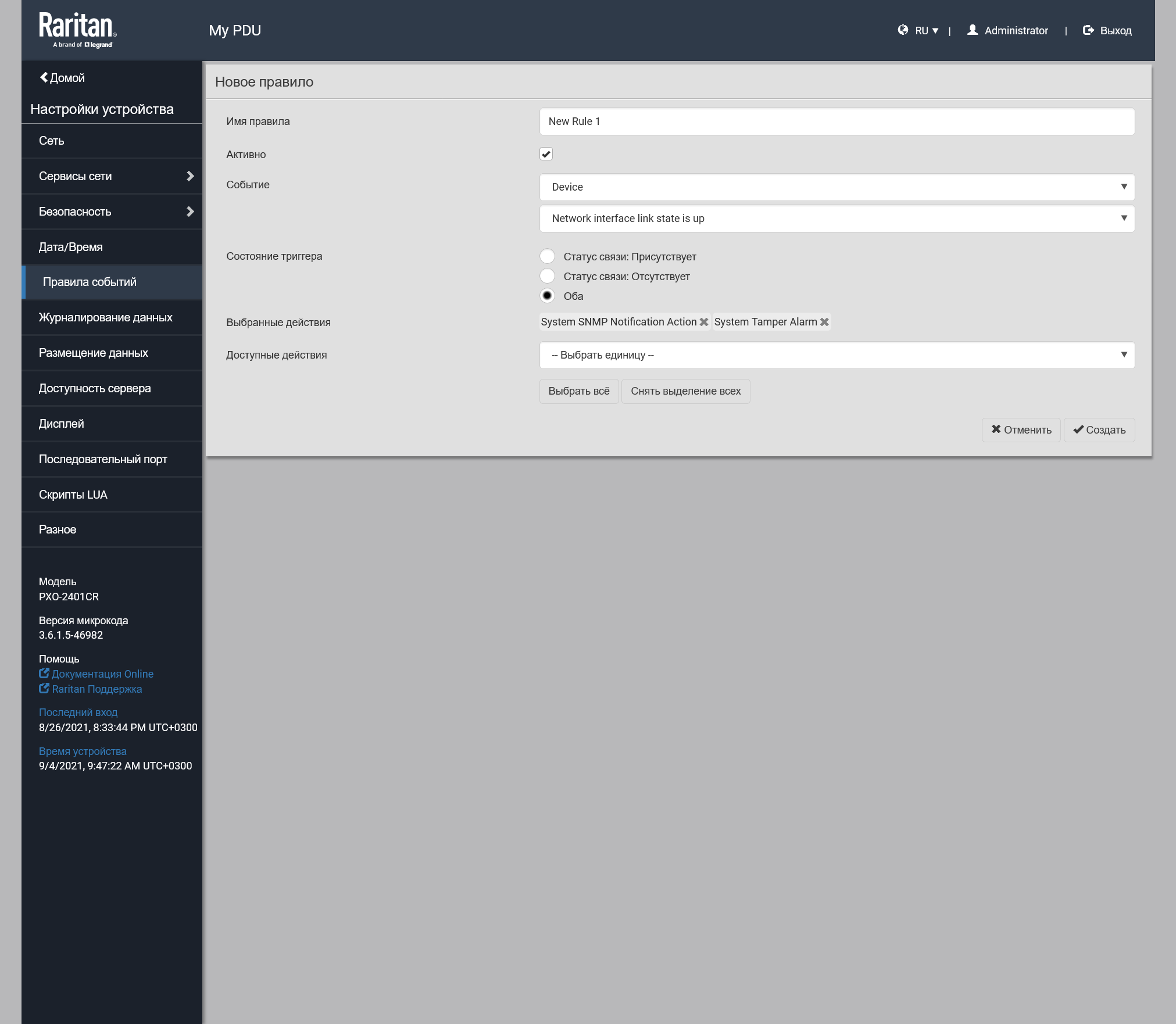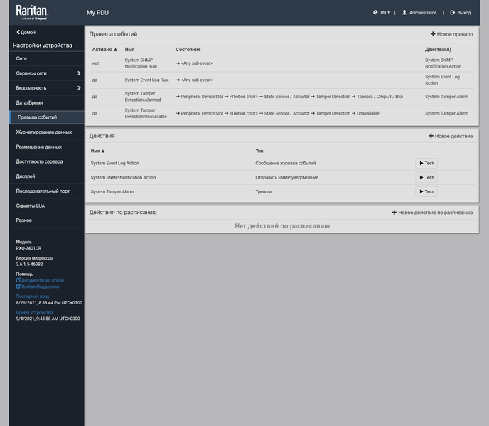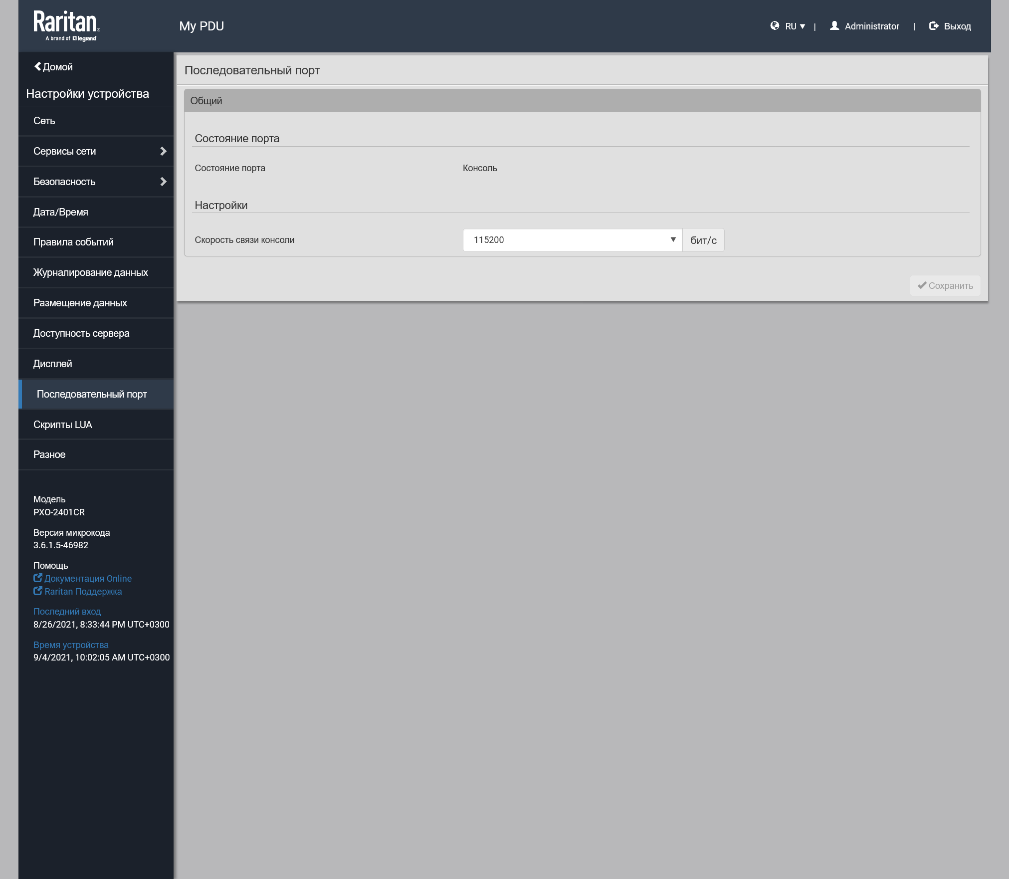 На странице «Дисплей» выбираются его вид и разрешенные с панели оператора действия — управление розетками и внешними устройствами, а также сброс сигнала тревоги. Для присутствующего в PDU последовательного порта через одноименный пункт меню можно выбрать скорость.