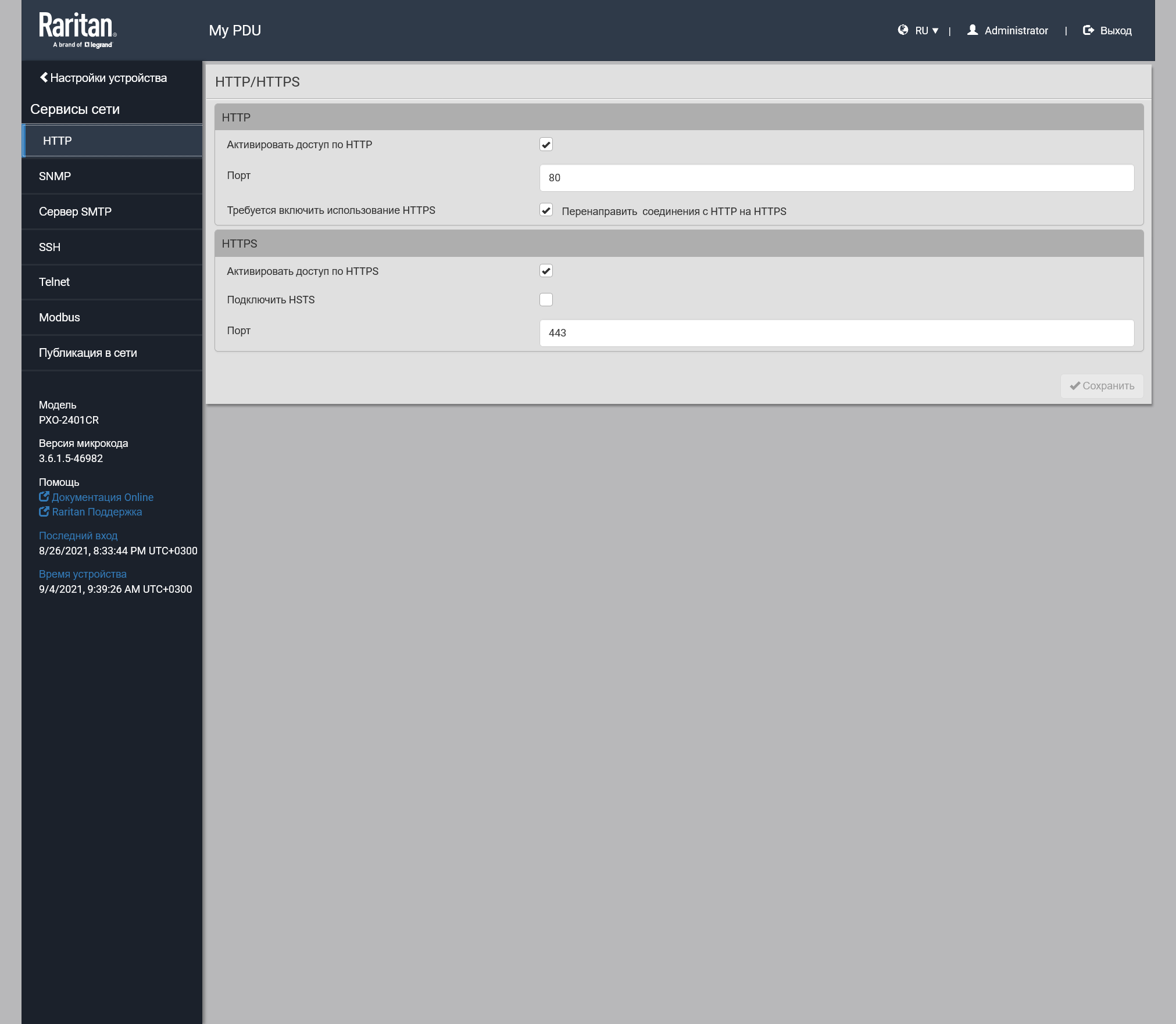 Страница «Сервисы сети» отвечает за настройку протоколов доступа к PDU, среди которых HTTP/HTTPS, SNMP, SSH и Telnet. Здесь же настраивается сервер SMTP для отправки уведомлений.