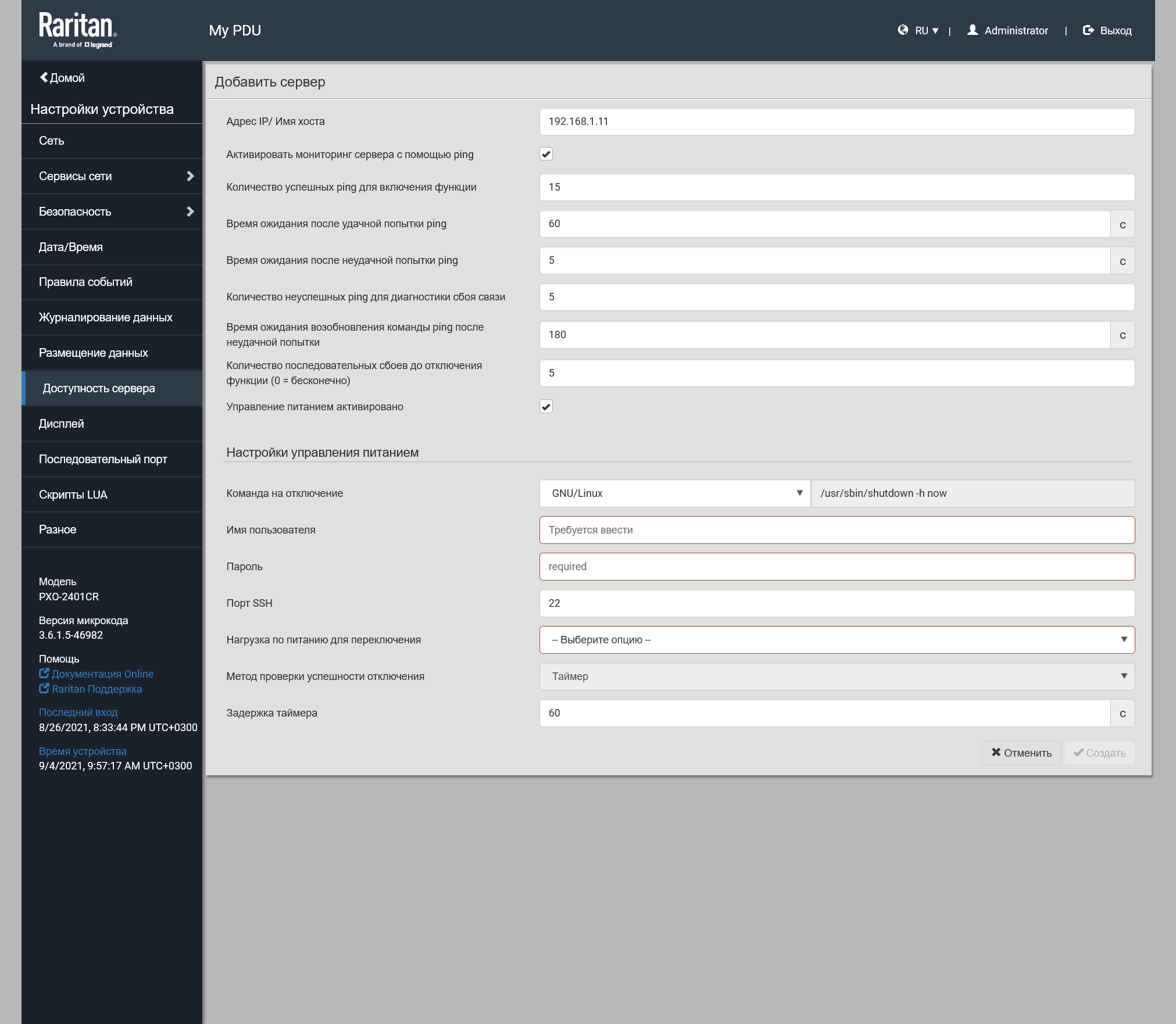 В системе есть встроенный сервис проверки доступности серверов на базе утилиты ping. При этом можно сразу здесь же настроить варианты действия при отсутствии отклика — перезагрузку через SSH или цикл для нужного выходного порта по питанию. Но также эти сенсоры будут представлены и в разделе «Правила событий».