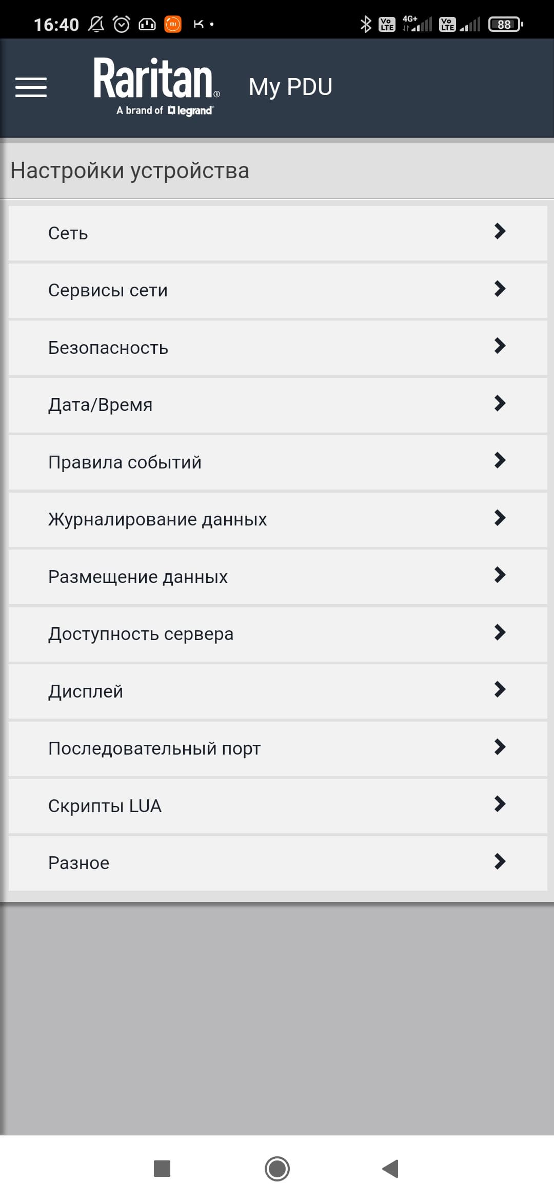 При нажатии кнопки с изображением круга пользователь попадает в меню, которое в данном устройстве состоит из семи пунктов. Среди них повторяются те же данные тревог и встроенного мониторинга входа и выхода, есть просмотр показаний датчиков, просмотр состояния и управление выходными разъемами и группами, управление внешними исполнительными устройствами, просмотр информации об устройстве (включая название модели, версию прошивки, сетевые адреса и так далее).