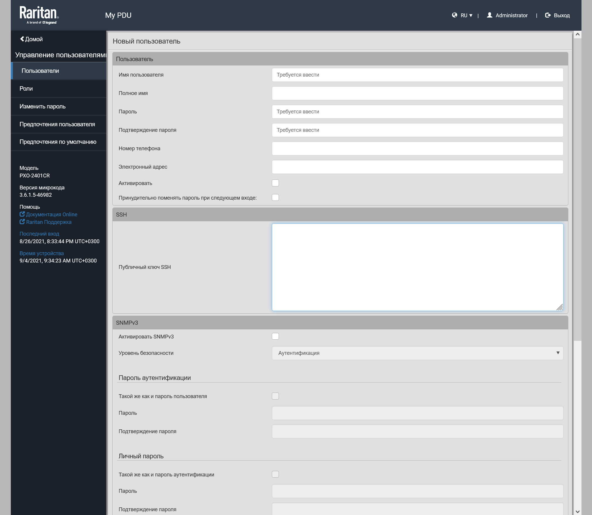 В карточке пользователя предусмотрено несколько информационных полей и выбор единиц изменения показателей с датчиков. Для аутентификации могут быть использованы как обычный пароль, так и работа с SSH по ключам, а также получение доступа по SNMPv3.