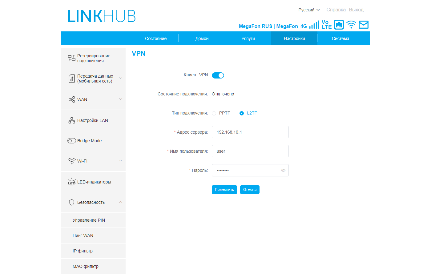 Роутер имеет встроенный клиент VPN с поддержкой протоколов PPTP и L2TP. Никаких особых настроек здесь нет. При активном соединении весь трафик всех клиентов перенаправляется через сервер VPN.