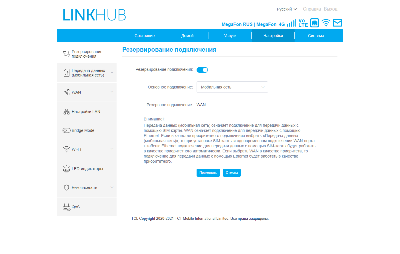 Детальные настройки роутера находятся в одноименном разделе. На первой странице можно включить режим резервирования и выбрать основное подключение. Тестирование показало, что при активном соединении по кабелю используется именно оно независимо от настройки. Если режим резервирования неактивен, возможности выбора рабочего подключения нет.