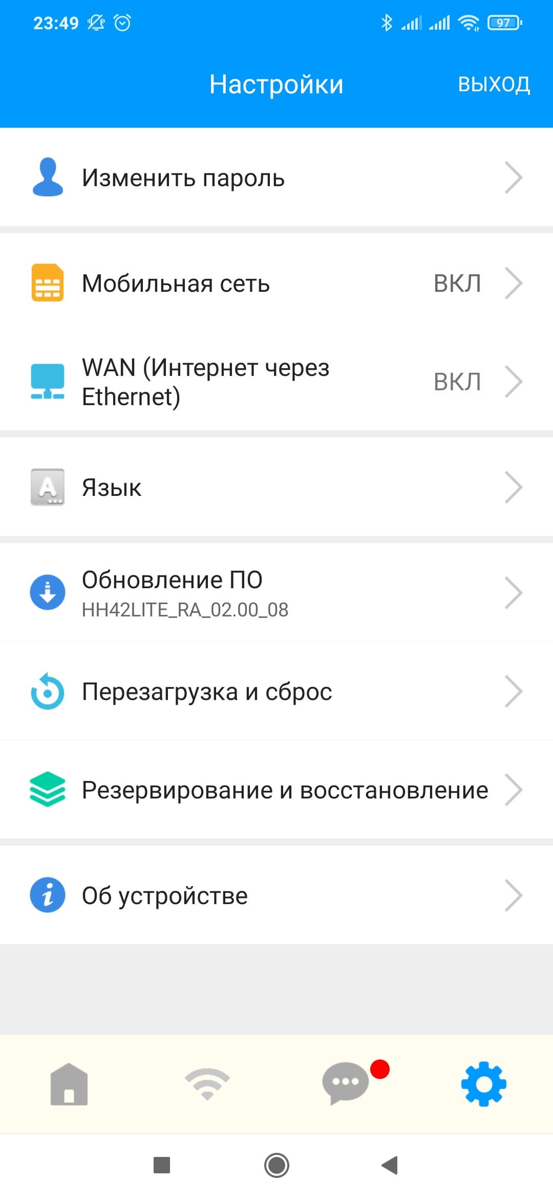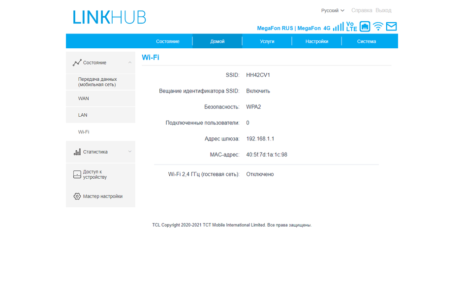 Во втором, «Домой», собрана более подробная информация о работе роутера. В разделе «Состояние» приводятся данные по интерфейсам — подключение к сотовому оператору, портам WAN и LAN, а также точке доступа Wi-Fi.