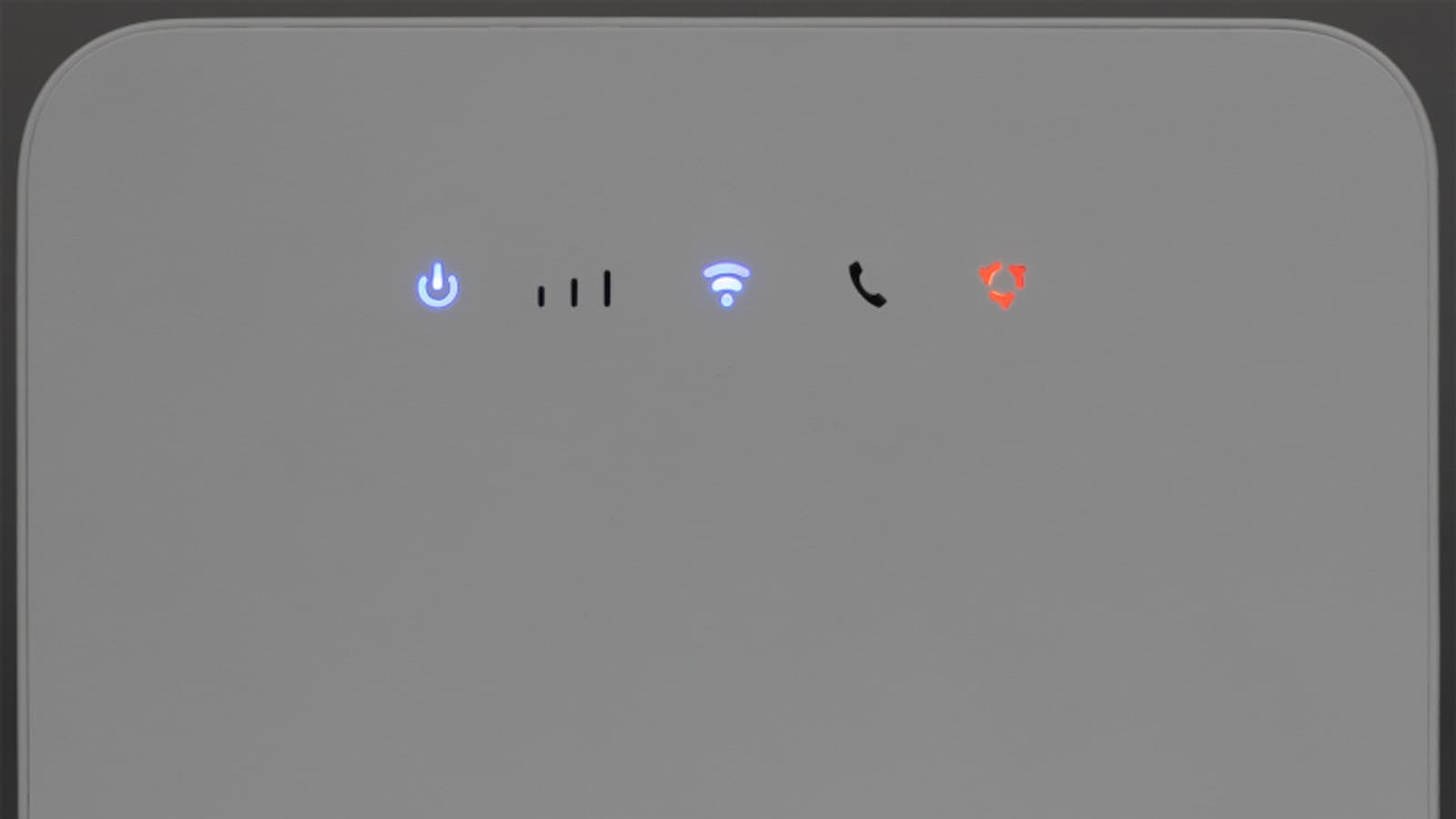 На лицевой панели роутера расположен логотип производителя и пять разноцветных индикаторов — питание, Wi-Fi, сотовая сеть, входящий звонок, статус подключения к интернету.