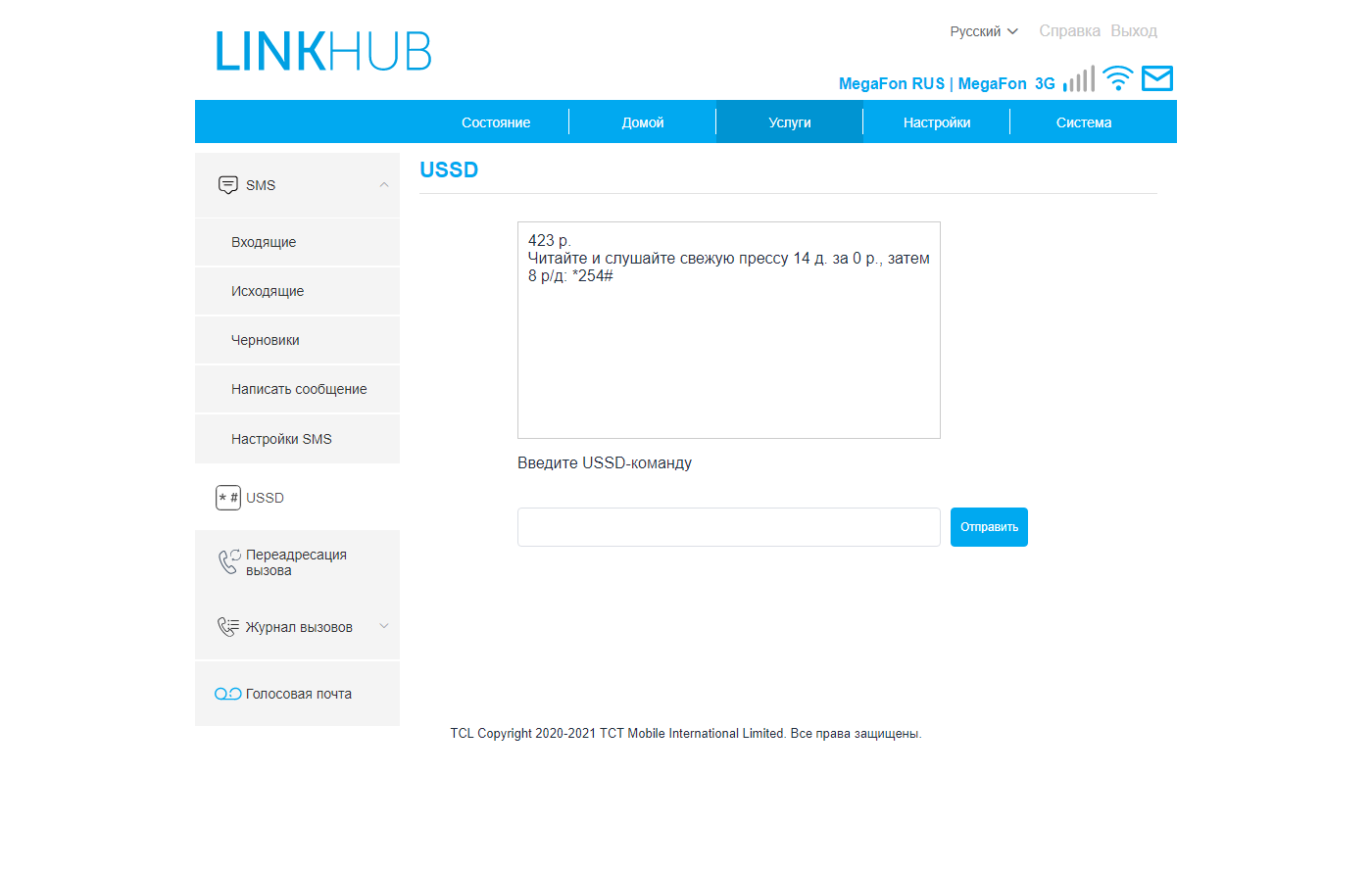 Раздел «Услуги» используется для работы с сервисами сотового оператора. Здесь есть функции приема и передачи SMS (при хранении в устройстве максимальное число сообщений — 255, на SIM-карте — только 15), отправка команд USSD (например, можно узнать баланс), настройка функции переадресации и журнал звонков (до 100 записей в каждом разделе).