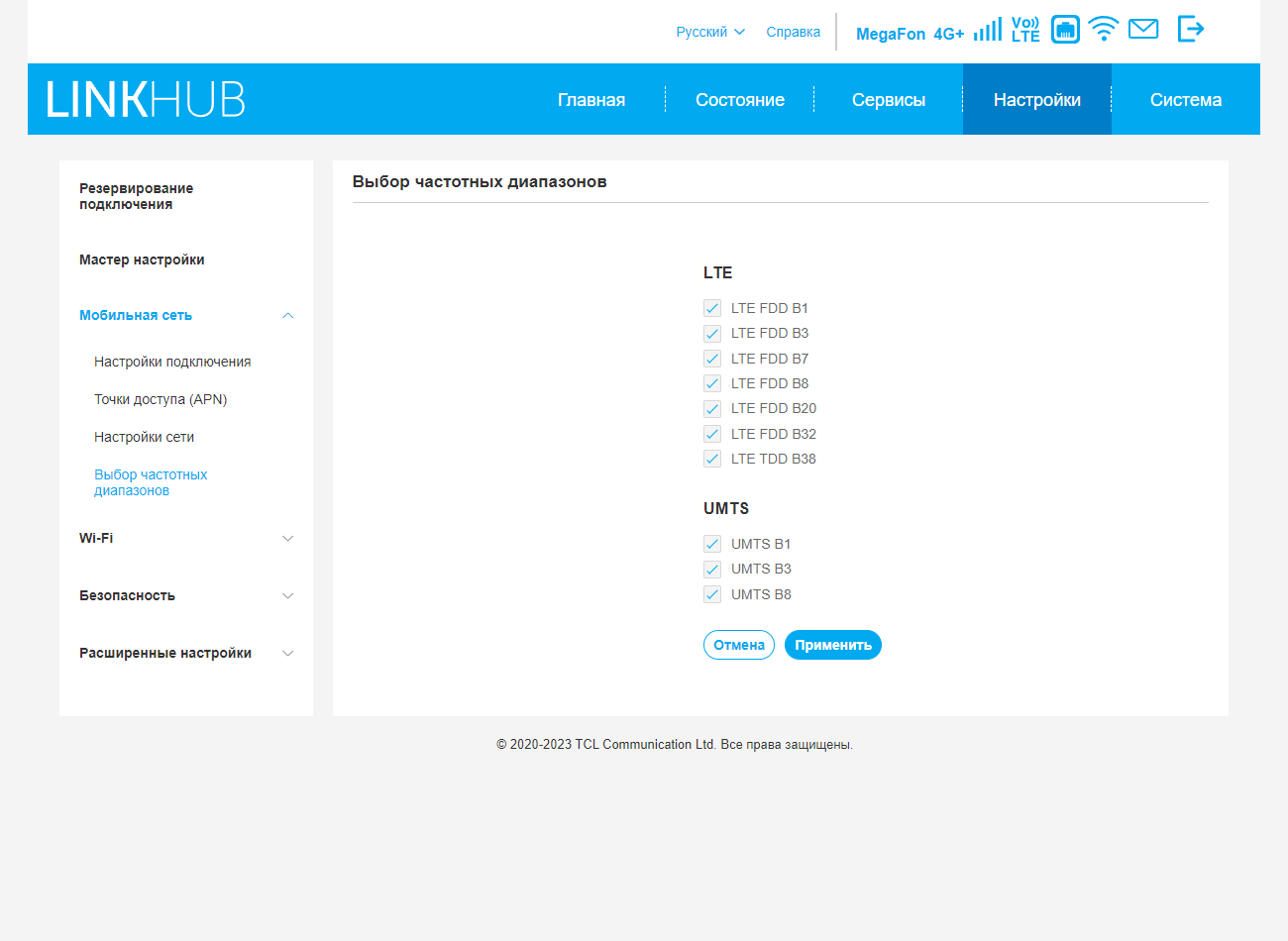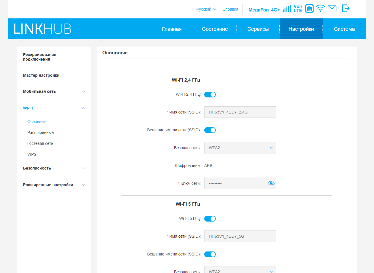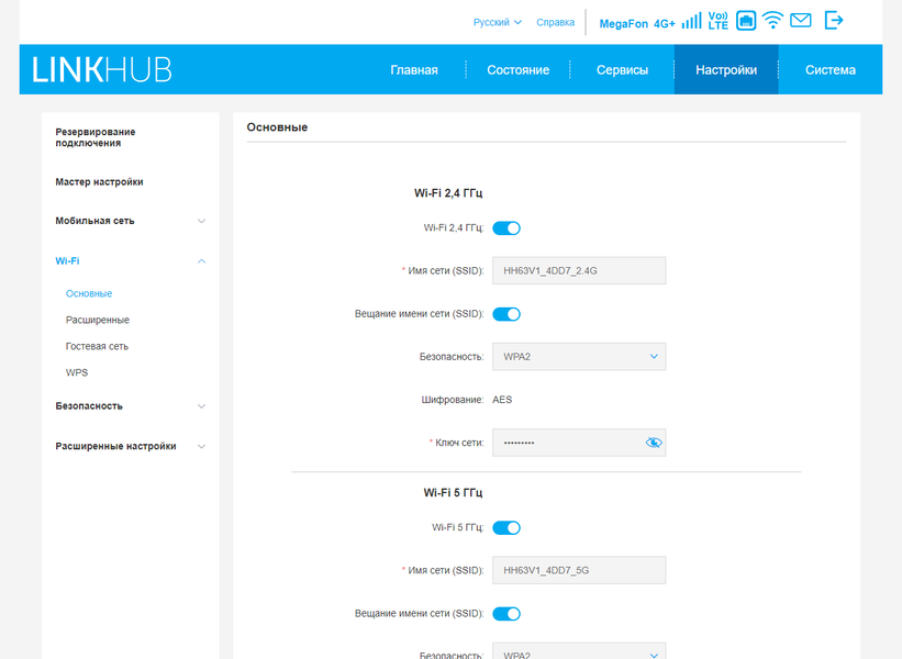 На первой его странице уточняется режим сети, можно включить роуминг, а также настроить профиль сотового оператора. На второй странице проверяем и меняем при необходимости имена и пароли беспроводных сетей для диапазонов 2,4 и 5 ГГц. На последней, третьей странице можно включить режим резервирования кабельного подключения связью через сотовый модем.