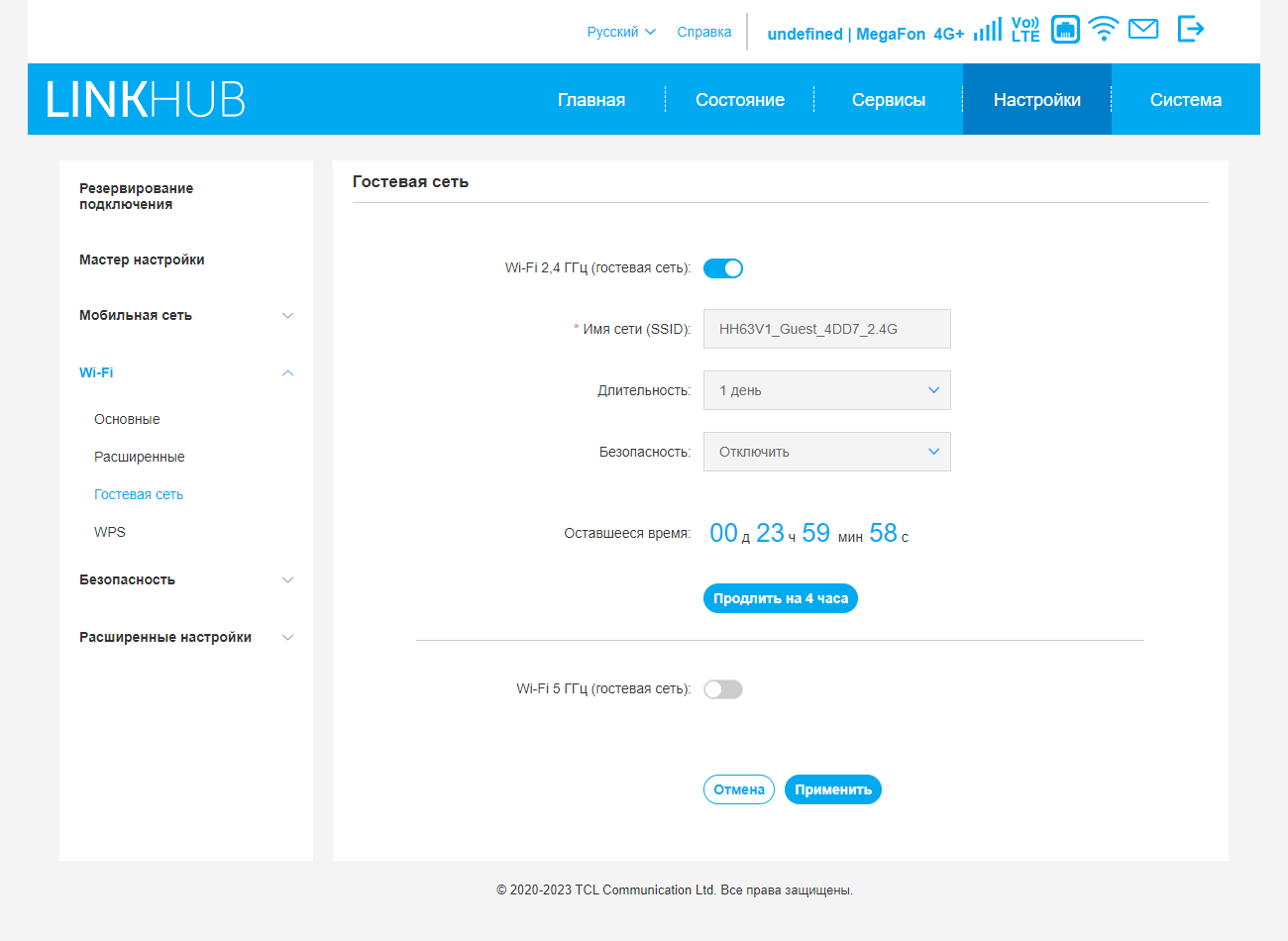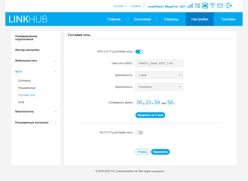В дополнение к основным сетям можно в каждом диапазоне включить и гостевую, у нее будет собственное имя и свой режим защиты. При этом можно также указать длительность работы гостевой сети, что достаточно удобно.