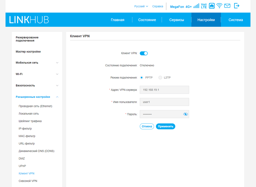 В роутере предусмотрены встроенные клиенты VPN с поддержкой протоколов PPTP и L2TP. Перенаправление трафика осуществляется сразу для всех клиентов локальной сети.