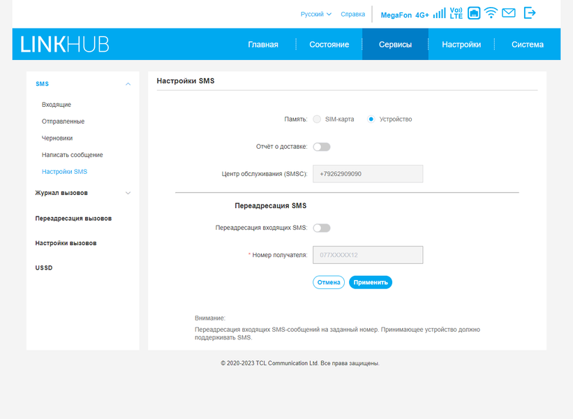 В группе «Сервисы» собраны полезные функции по работе с сотовой сетью. В частности, речь идет о работе с SMS и голосом — доступны прием и передача сообщений, есть журналы вызовов (напомним, что роутер поддерживает работу с голосом через VoLTE). В настройках можно активировать режим переадресации для сообщений и голосовых звонков. Есть в роутере и поддержка работы с командами USSD. Всё это существенно упрощает контроль и управление номером, так что даже не потребуется переустановка карточки в смартфон для проверки баланса или привязки к личному кабинету.