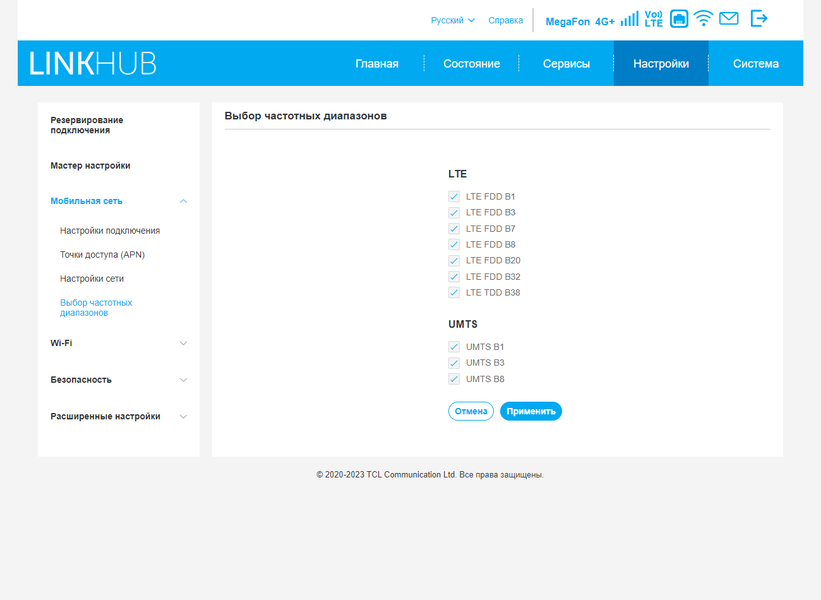 Основная характеристика — возможности встроенного сотового модема. В данном устройстве установлен модем для работы в сетях третьего и четвертого поколений, обеспечивающий скорости приема и передачи в конфигурации LTE Cat6 до 300/50 Мбит/с. Набор поддерживаемых диапазонов может зависеть от региона, в протестированной модели это LTE FDD B1/3/7/8/20/32, TDD B38 и UMTS B1/3/8. Привязки к оператору конечно нет. Используется карта формата Nano-SIM. Есть поддержка голосовых вызовов через VoLTE и порт RJ11 для телефонного аппарата. Через веб-интерфейс можно пользоваться SMS и USSD. К сожалению, производитель реализовал только встроенные антенны, что может ограничивать использование модели в зонах со слабым сигналом.