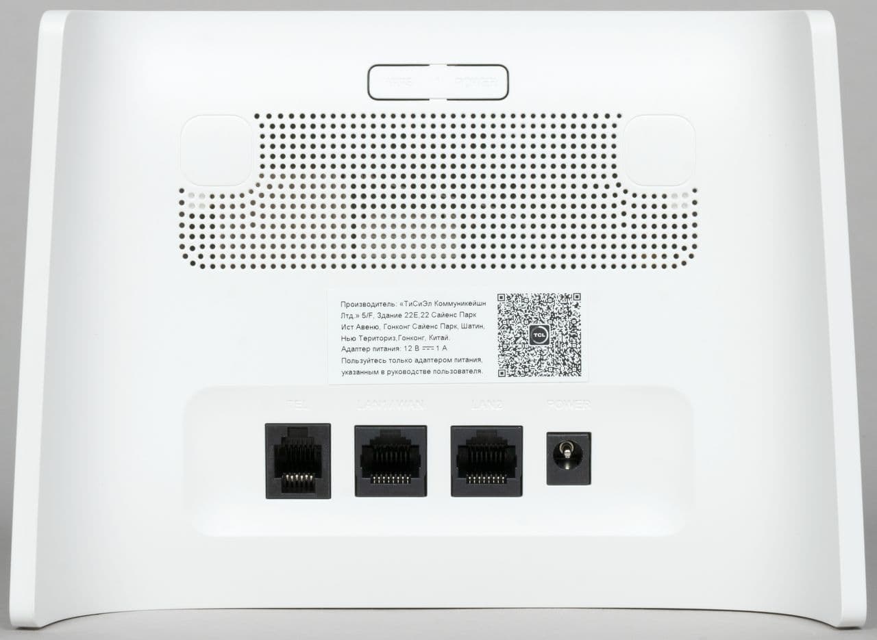 Сзади сверху находятся две кнопки управления — WPS для подключения беспроводных клиентов и кнопка питания. Последняя может быть использована, если нужно оперативно выключить устройство. Ниже видна решетка системы охлаждения. У других модификаций модели, вероятно, есть и поддержка подключения внешних антенн к сотовому модему, но в нашем случае такой опции нет. Код на наклейке ведет на мобильное приложение TCL Connect для настройки и управления роутером.