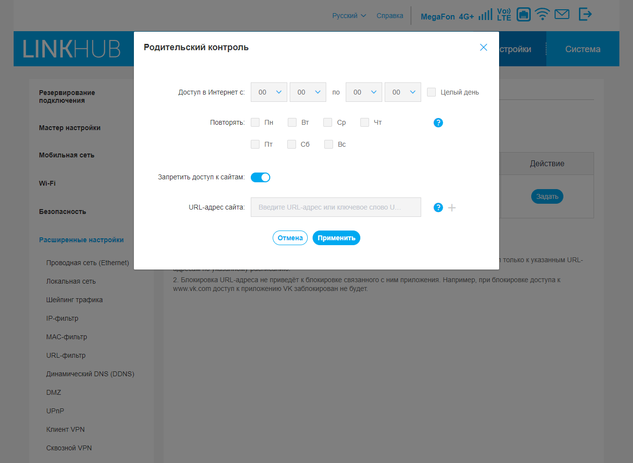 В прошивке предусмотрено создание трех типов фильтров трафика на базе белых/черных списков, которые могут пригодиться в достаточно специфических ситуациях и большинству пользователей не нужны: IP-фильтр работает по таблице с указанием IP-адресов и портов отправителя и получателя, для MAC- и URL-фильтров в таблице указываются соответствующие объекты. Отдельно настраивается «Родительский контроль»: для каждого клиента локальной сети можно указать, какие сайты в какое время не будут доступны.